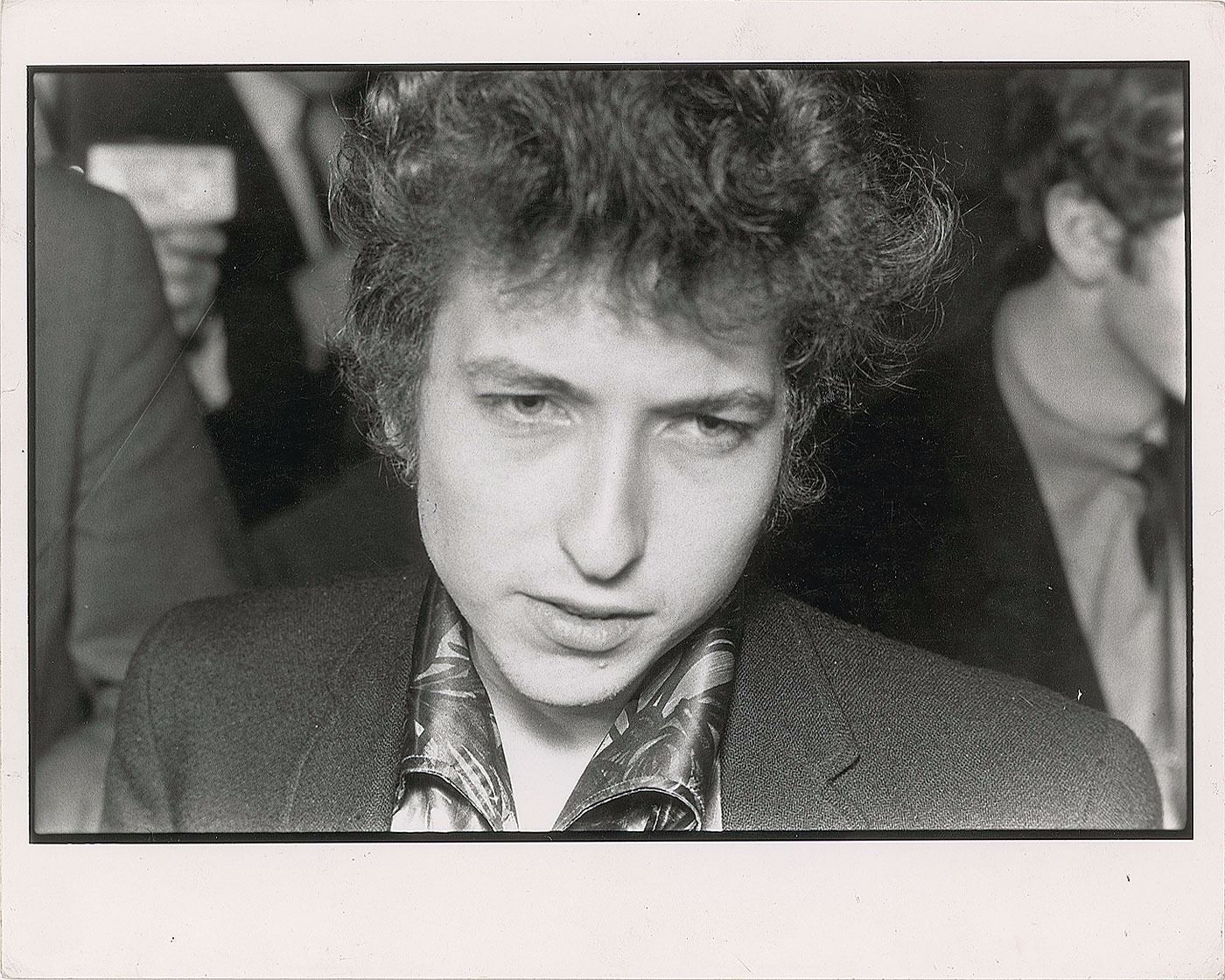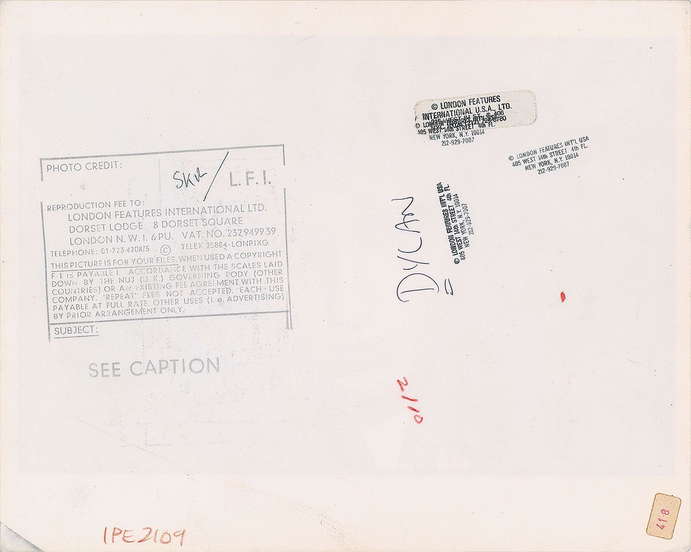 Great original glossy 10 x 8 silver gelatin close-up photo of Bob Dylan taken in the 1960s, likely printed from the original negative circa 1970s–80s. Reverse bears an SKR/ London Features International credit stamp. In fine condition. London Features International was a London-based photo agency that started in the 1960s, and licensed photographs to magazines and newspapers for publication.