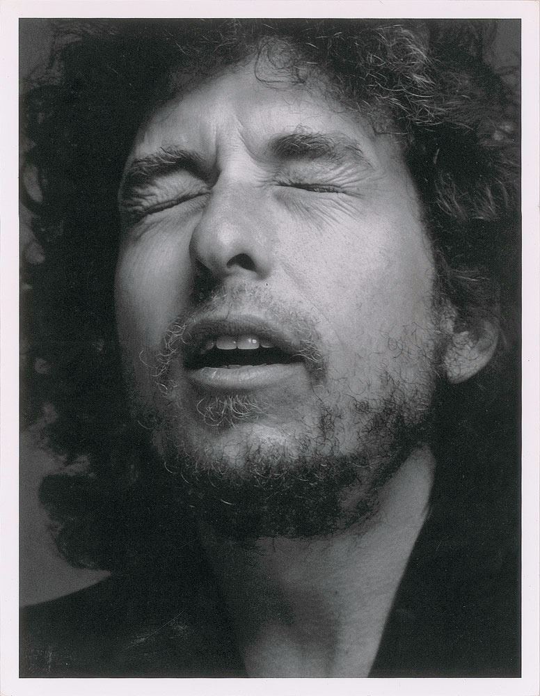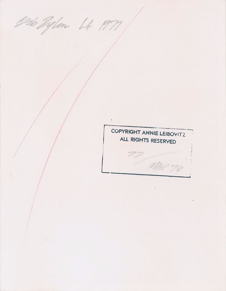 Wonderful original semi-glossy 8.5 x 11 close-up photo of Dylan with his eyes closed and singing, taken by Annie Leibovitz in 1977 Los Angeles, reverse bears a Leibovitz copyright stamp annotated in pencil, "77/Mar 78." In very fine condition.