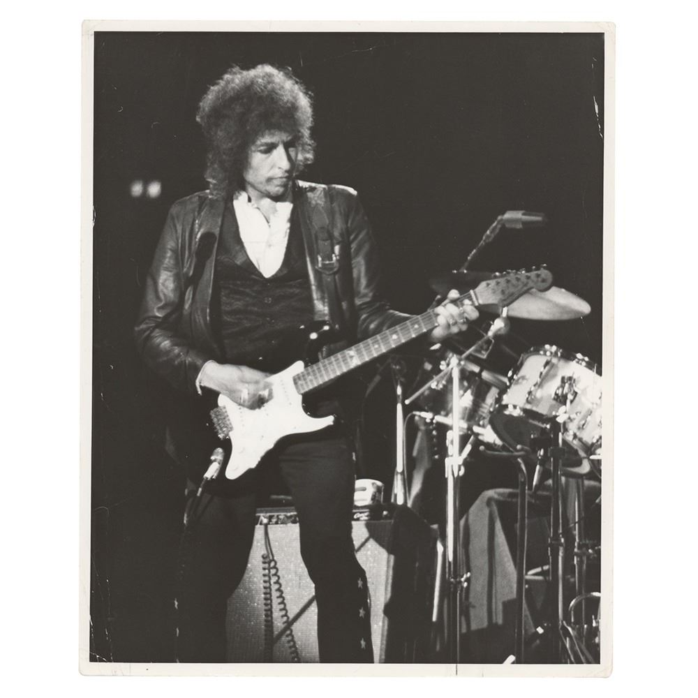 Original glossy 8 x 10 silver gelatin photograph of Bob Dylan on stage and playing his Fender Stratocaster electric guitar. Reverse bears a Retna Ltd. credit stamp. In very good condition, with scattered creasing.