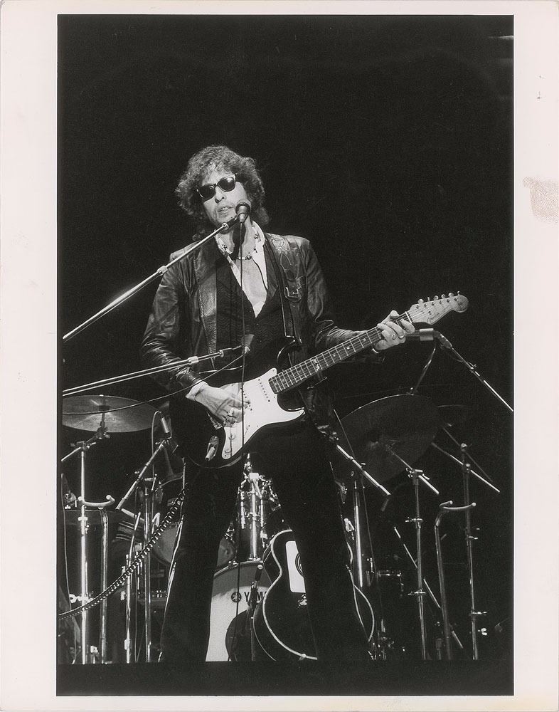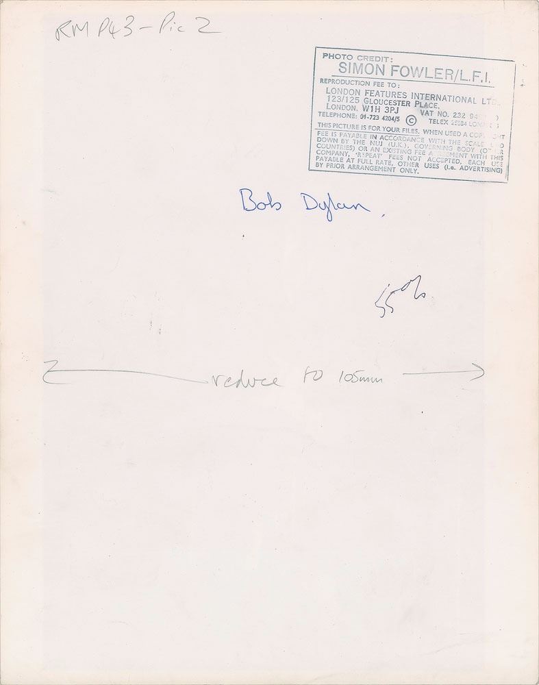 Original vintage matte-finish 9.5 x 12 silver gelatin photo of Bob Dylan playing his Stratocaster on stage. Reverse bears a Simon Fowler/London Features International credit stamp. In fine condition, with a fingerprint smudge to the right border. Simon Fowler is a prominent English photographer/director known for his work with numerous singers and bands, ranging from Kylie Minogue to Iron Maiden. From the Globe Photo archives.