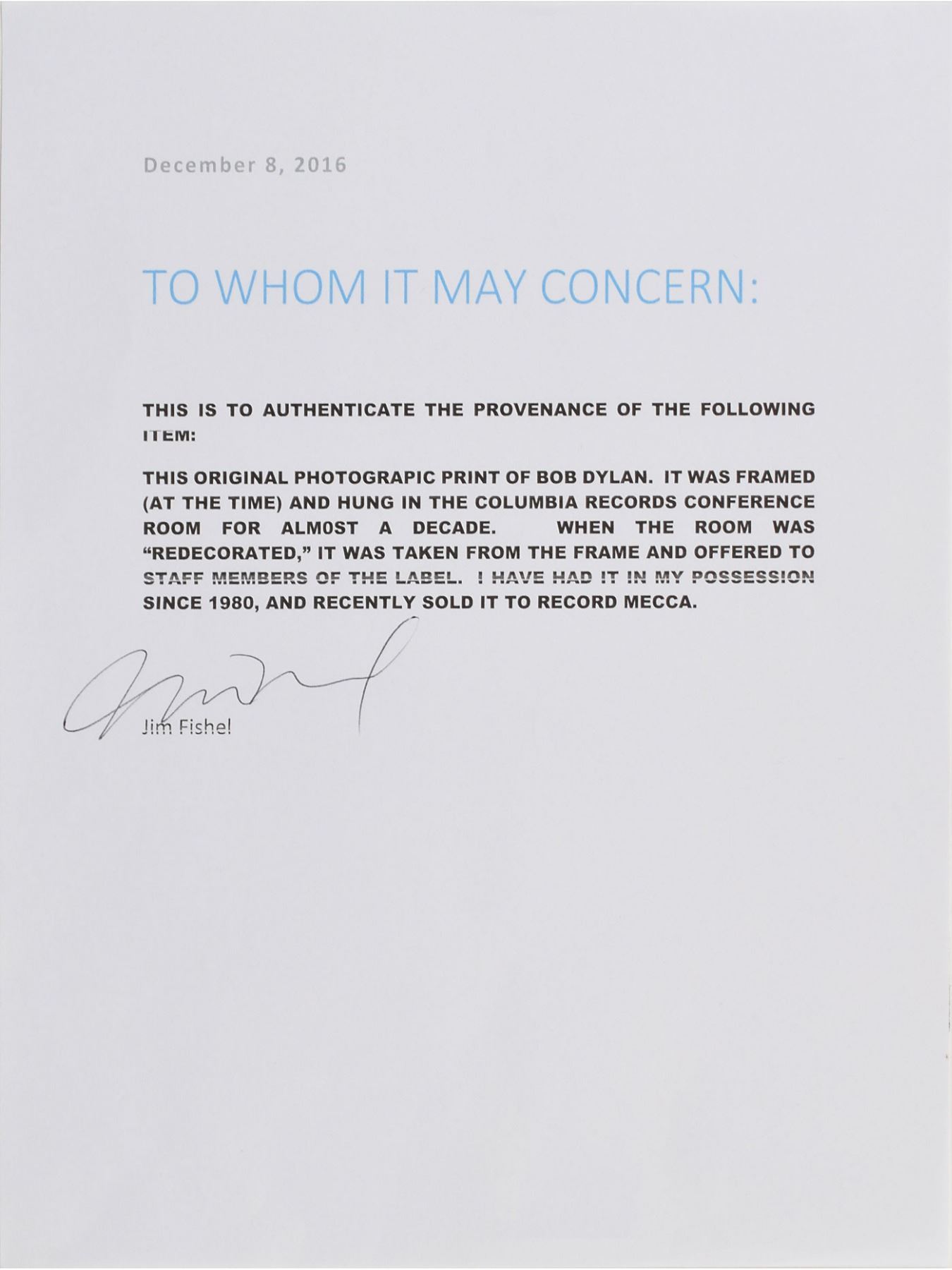 Vintage circa 1970s color satin-finish 11.5 x 20 photo of Bob Dylan that once hung in the Columbia Records conference room. Reverse bears "This paper manufactured by Kodak" watermarks. In fine condition, with scattered creasing. Accompanied by a letter of provenance from a former Columbia Records VP, stating, "It was framed (at the time) and hung in the Columbia Records conference room for almost a decade. When the room was 'redecorated,' it was taken from the frame and offered to staff members of the label. I have had it in my possession since 1980."