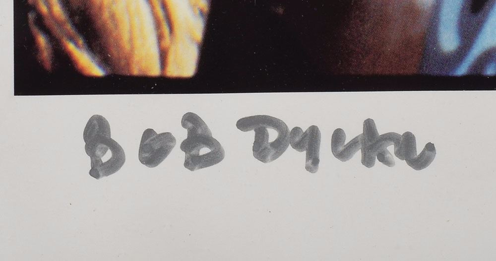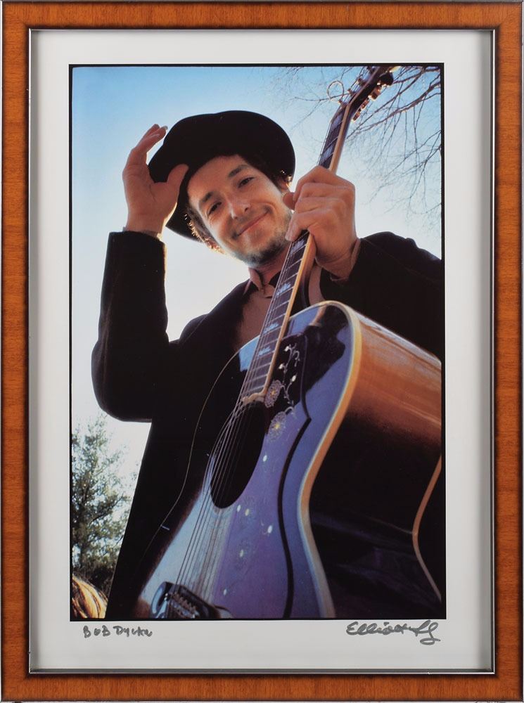 Classic oversized color 15.5 x 21.5 print of the iconic Nashville Skyline album cover photograph by Elliott Landy, signed and titled in the lower border in silver ink, "Bob Dylan, Elliott Landy." Framed and in fine condition.
