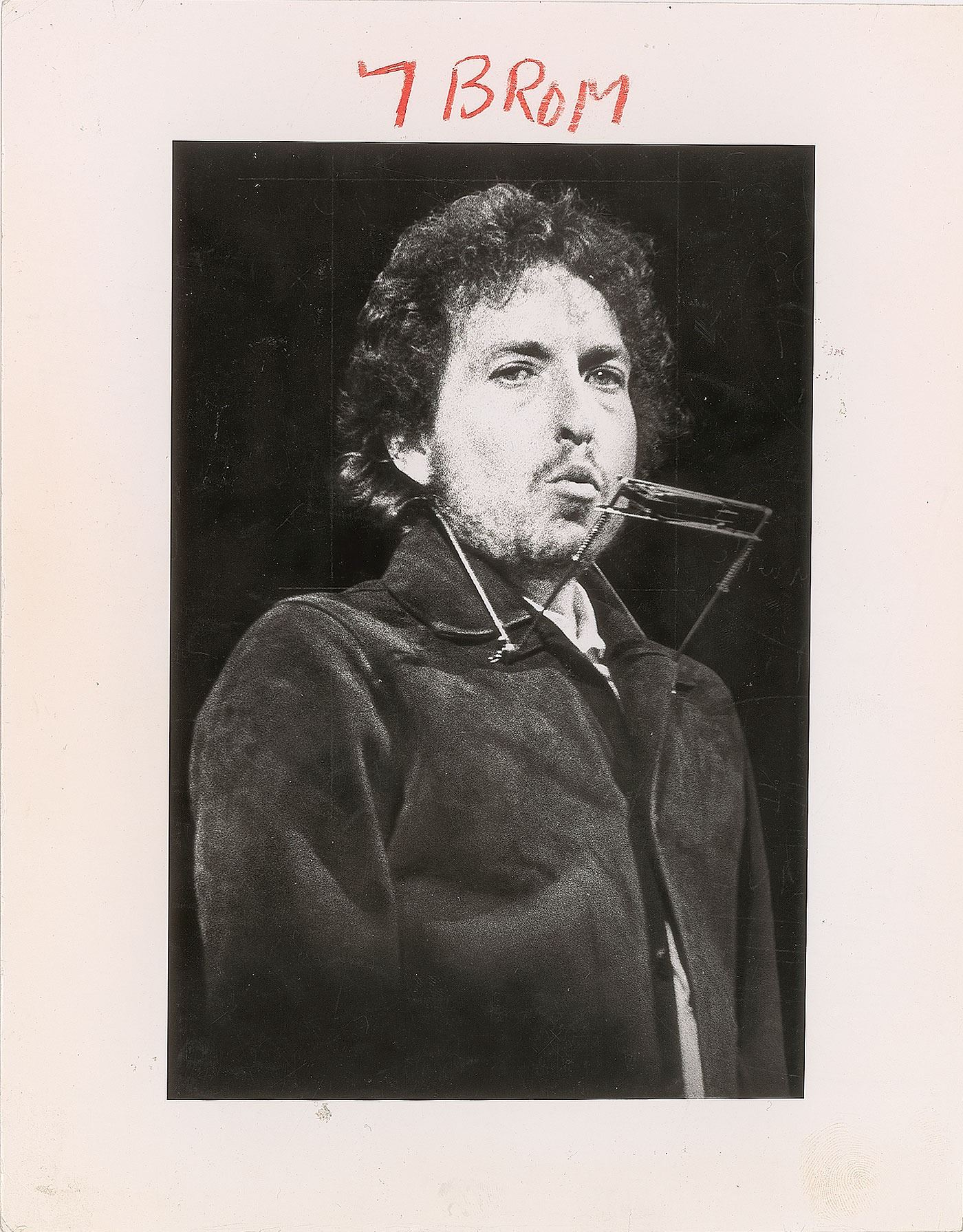 Original vintage glossy 8 x 10 silver gelatin photo of Dylan with his harmonica in January 1974. Reverse bears Neal Preston and London Features International Ltd. credit stamps, as well as editorial notations. In fine condition, with scattered creases and surface marks from notations on reverse. Neal Preston is recognized as one of the top rock photographers. From the Globe Photo archives.