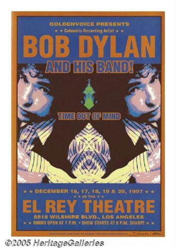 <B>Bob Dylan - Posters, Group of 11 (Various).</B></I> A wall full of memorabilia from one of the greatest folk/rock singers of all time! This group includes nine posters from recent Bob Dylan tours. While the size of these posters vary all the posters are near mint condition. Opening acts were mostly either Joni Mitchell or Phil Lesh and friends. Also included are two handbills from recent Bob Dylan tours. A great batch of newer posters from this classic performer. Average NM.