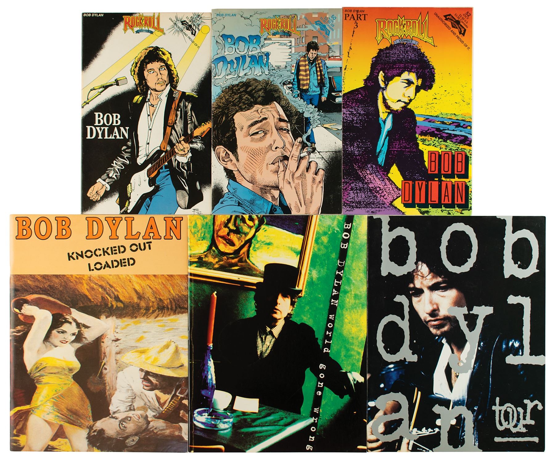 Collection of 13 programs and publications associated with Bob Dylan, including: Rock and Roll Comics: Bob Dylan (Parts 1–3); three issues of On the Tracks; a program from Bob Dylan and Eric Clapton at the Blackbushe Aerodrome in 1978; a 1993 UK tour program; sheet music songbooks for Bob Dylan's 'Good as I Been to You,' 'World Gone Wrong,' and 'Knocked Out Loaded,' and the Traveling Wilburys' 'Vol. 1' and 'Vol. 3.' In overall very good to fine condition, with dampstaining to the cover of the Dylan/Clapton program.