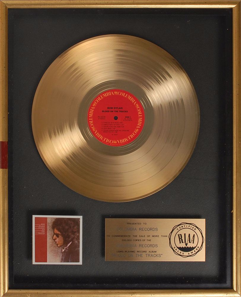 Official floater-style RIAA gold sales award presented "to Columbia Records to commemorate the sale of more than 500,000 copies of the Columbia Records long-playing record album 'Blood on the Tracks.'" Framed with its disc, plate, and album cover image to an overall size of 16.75 x 20.75. Award retains its original backing. In fine condition, with a block of red paint to the left side of the frame. Considered one of Dylan's best albums, Blood on the Tracks reached number one on the Billboard 200 charts and in 2003 was ranked number 16 on Rolling Stone's list of the 500 greatest albums of all time.