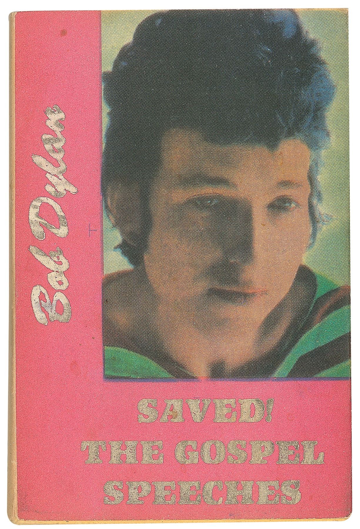 Uncommon unsigned pocket-sized book: Saved! The Gospel Speeches of Bob Dylan. First edition. Madras & New York: Hanuman Books, 1990. Softcover with jacket, 2.75 x 4.25, 115 pages. In fine condition, with some light foxing to fore-edge. This is an unusual compilation of Dylan's spontaneous monologues and thoughts on Christianity as a new convert.