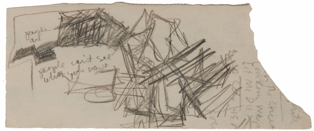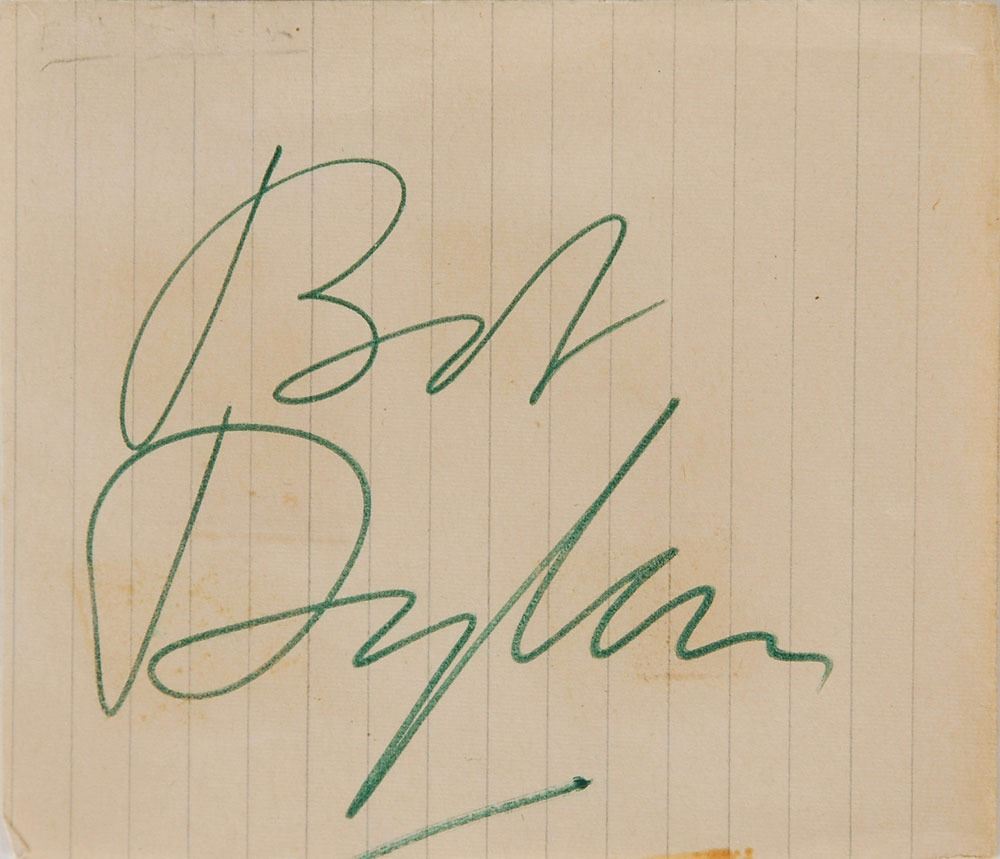 Two scarce items: a felt tip signature, "Bob Dylan," on an off-white 4.25 x 3.75 lined sheet; and a rare circa 1962 handwritten partial set list in pencil on a 2.5 x 6.25 sheet filled with doodles. The remaining portion of the set list reads: "The Street, Low Down Ways, Let Me Die," with vertical writing near the bottom, "People are, people can't see, what you want." Both sides of the sheet are filled with pencil doodles. In overall very good to fine condition, with absent upper left portion to list and mild toning to signature.