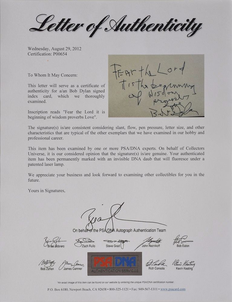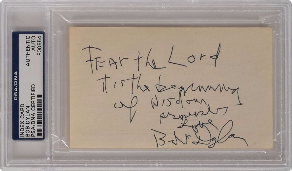 Ink signature, "Fear the Lord, it is the beginning of wisdom, Proverbs, Love, Bob Dylan,” on an off-white 5 x 3 card. Encapsulated in a plastic PSA/DNA authentication holder. In fine condition. Accompanied by full letters of authenticity from REAL and PSA/DNA. Consignor notes that the signature was obtained not long after the release of Dylan's 1980 album Saved, the second album of Dylan's 'Christian trilogy' following his conversion to born-again Christianity. An exceedingly sought-after item given Dylan's reluctance to sign and the addition of his rare inspirational quote.