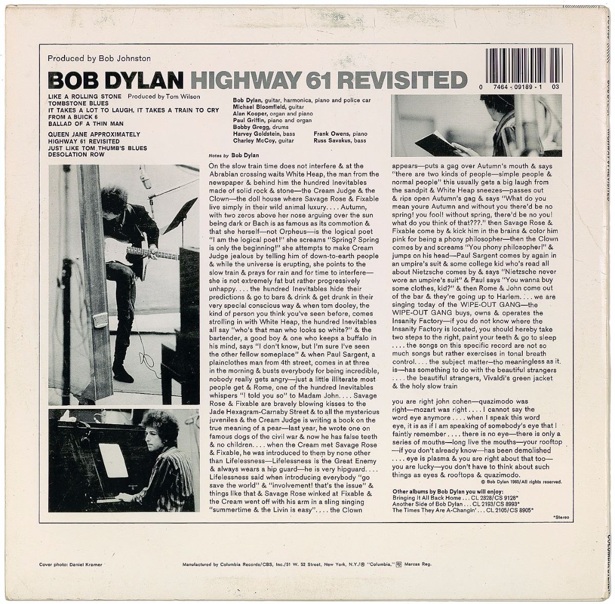 Highway 61 Revisited album signed in person on the front cover in blue felt tip by Dylan. In fine condition. The record is not included. Originally obtained by in-person specialist Mike Wehrmann, who added a notation inside the sleeve that it was signed in Garden City, New York, on June 29, 2007. A rare example of the famous album when Dylan ‘went electric.’