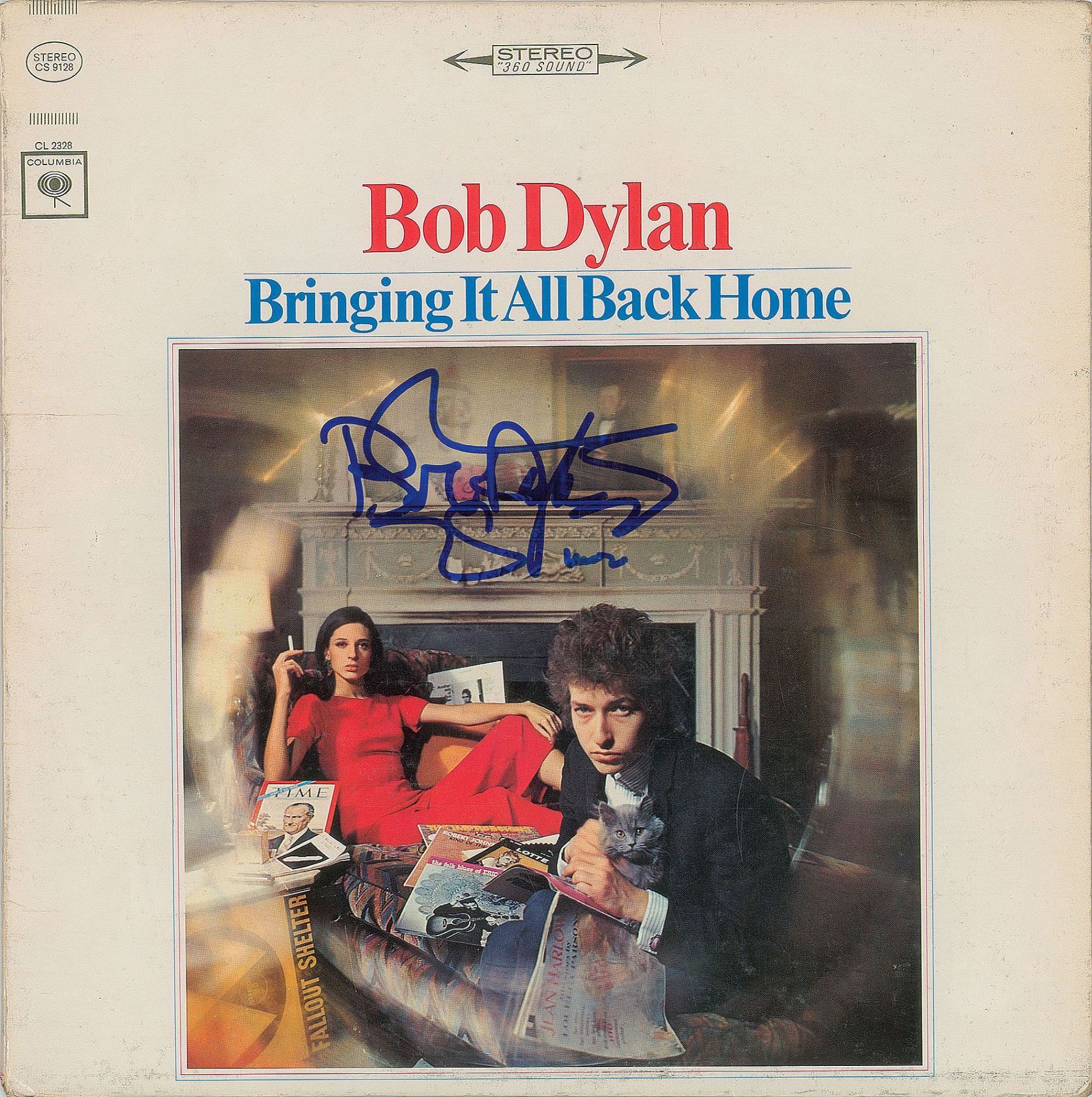 Bringing It All Back Home album signed on the front cover in blue felt tip by Dylan. In fine condition. The record is not included. A scarce signed example of one of Dylan's greatest and most influential albums—the record was Dylan's first to break into the US top 10, with the opening track, 'Subterranean Homesick Blues,' becoming his first single to chart in the US.