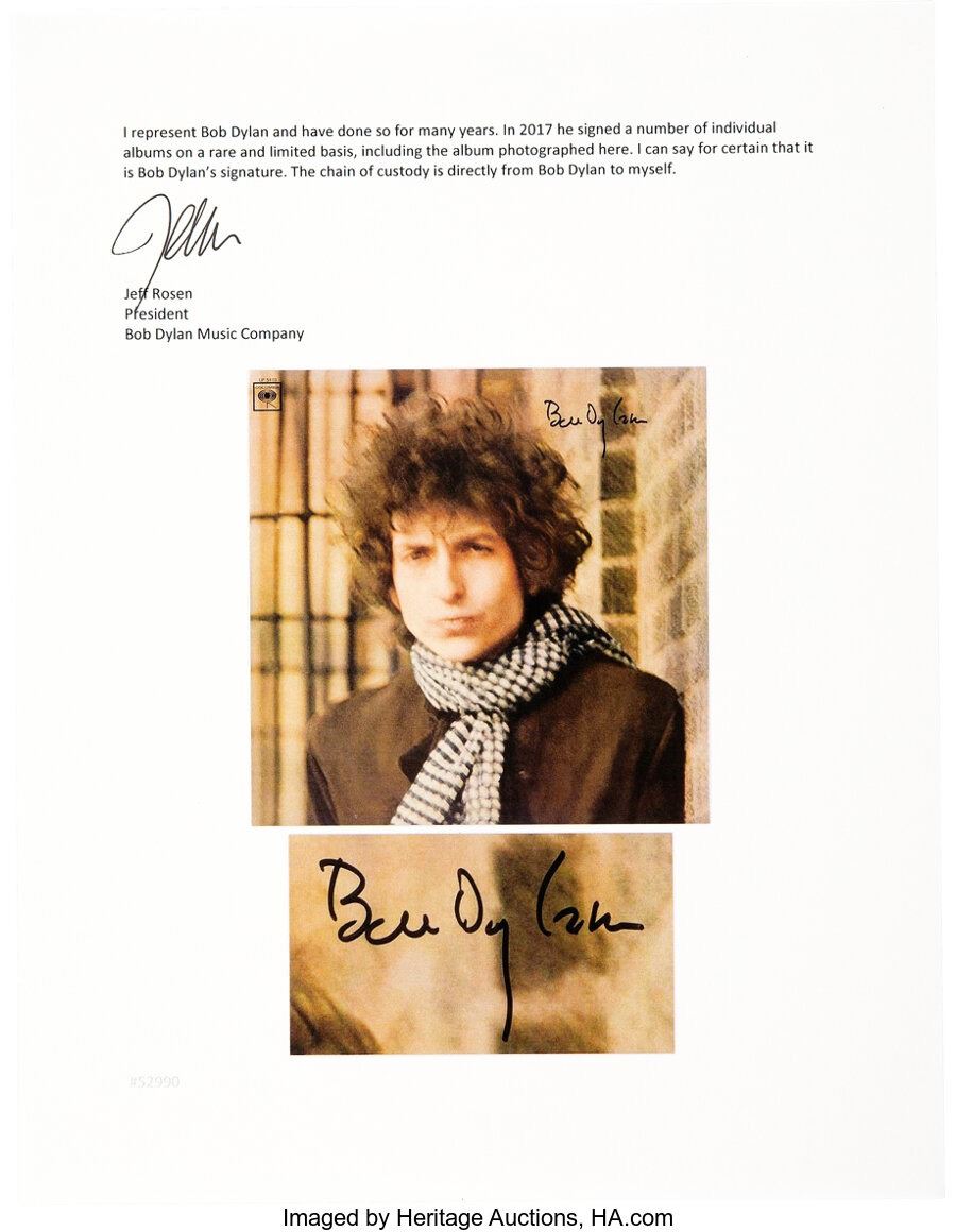 Bob Dylan SignedBlonde On BlondeVinyl LP Reissue (Columbia/Sundazed, LP 5110).A reissue of the classic double-LP featuring "Rainy Day Women #12 35" and "I Want You" signed by the former Robert Zimmerman with a thin black felt tip. Jacket is in NM 8 condition and the discs are on MT 9 condition. Signed in 2017. LOA from Jeff Rosen, president of the Bob Dylan Music Company. COA from Heritage Auctions.