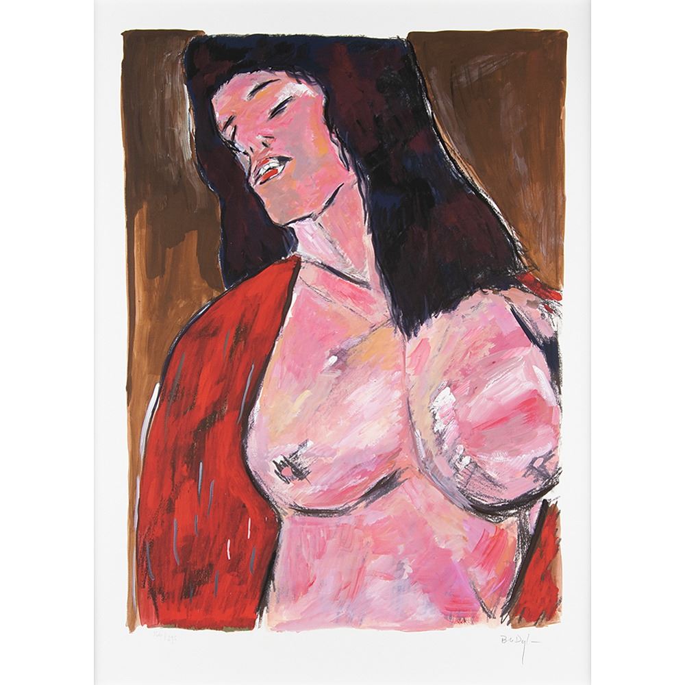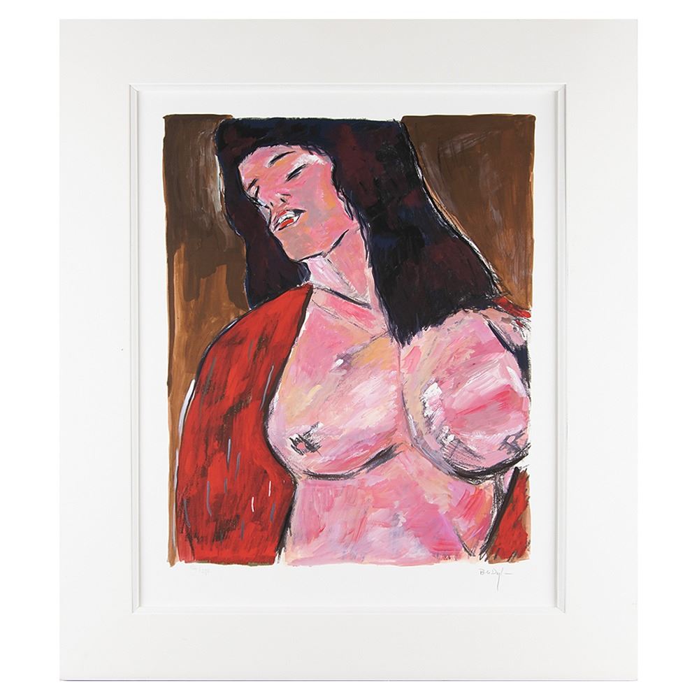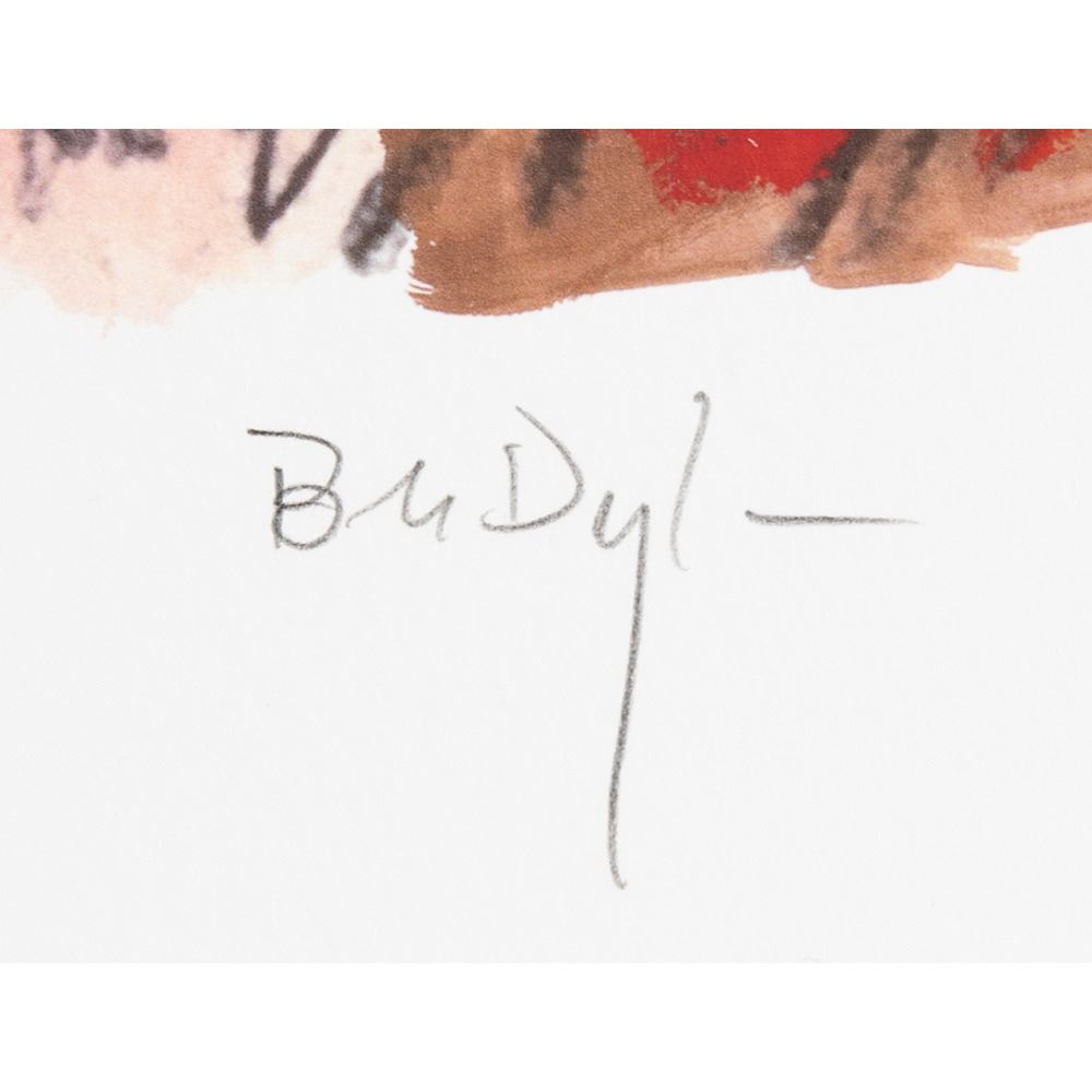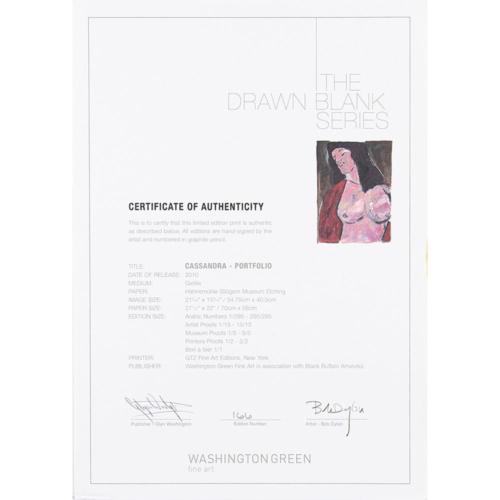 Limited edition color 22 x 26.5 giclee print entitled ‘Cassandra – Portfolio,' numbered 166/295, signed in the lower right corner in pencil, "Bob Dylan." Published as part of The Drawn Blank Series, Washington Green/Black Buffalo Artworks, 2010. Matted to an overall size of 25 x 31.5, with a mat opening of 18 x 24.5. Accompanied by a certificate of authenticity from Washington Green Fine Art. Dylan's popular Drawn Blank art series—a visual autobiography capturing his life on the road—colorfully portrays the people and places he has encountered over the course of his 'Never Ending Tour.'