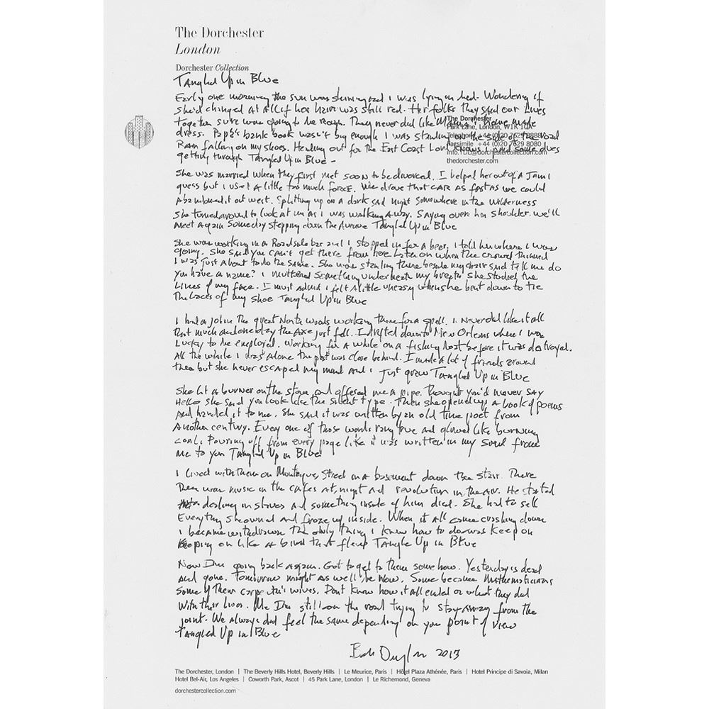 Hugely desirable handwritten lyrics by Bob Dylan for his influential single, "Tangled Up in Blue," one page, 8.25 x 11.75, The Dorchester of London letterhead, written in black ink and signed neatly at the conclusion, "Bob Dylan, 2013."