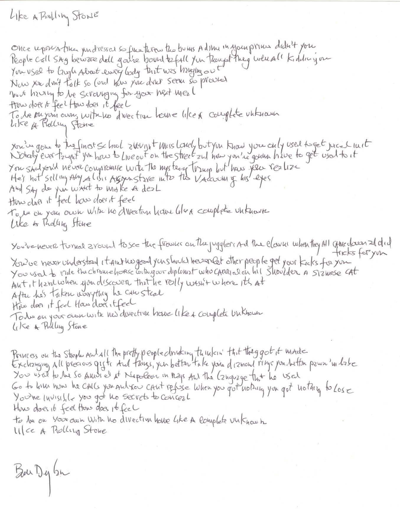 545. Bob Dylan Handwritten and Signed Lyrics to his classic song "Like a Rolling Stone". (1965, later handwritten in 2017) One of the most covered and influential songs of all time, these "Like a Rolling Stone" lyrics are handwritten and signed by their creator, Bob Dylan, on a single leaf of 8.5 x 11 in. heavy stock paper. In 1965, Dylan had become disillusioned with the high expectations of the fans and music industry, and was quoted in a 1966 Playboy interview, saying: "Last spring, I guess I was going to quit singing. I was very drained, and the way things were going, it was a very draggy situation ... But Like a Rolling Stone' changed it all. I mean it was something that I myself could dig. It's very tiring having other people tell you how much they dig you if you yourself don't dig you." The song grew out of an extended piece of verse. Dylan described its genesis to journalist Jules Siegel: "It was ten pages long. It wasn't called anything, just a rhythm thing on paper all about my steady hatred directed at some point that was honest. In the end it wasn't hatred, it was telling someone something they didn't know, telling them they were lucky. Revenge, that's a better word. I had never thought of it as a song, until one day I was at the piano, and on the paper it was singing, "How does it feel?" in a slow motion pace, in the utmost of slow motion." The song has been covered by Jimi Hendrix, The Rolling Stones and countless others, and inspired even more, Guns N Roses even paraphrased "You don't talk so loud, and you don't talk so proud" in their song, "Estranged", an obvious homage to the master songwriter. Bruce Springsteen first heard it when he was 15 years old: "on came that snare shot that sounded like somebody'd kicked open the door to your mind...The way that Elvis freed your body, Dylan freed your mind, and showed us that because the music was physical did not mean it was anti-intellect. He had the vision and talent to make a pop song so that it contained the whole world. He invented a new way a pop singer could sound, broke through the limitations of what a recording could achieve, and he changed the face of rock'n'roll for ever and ever."
