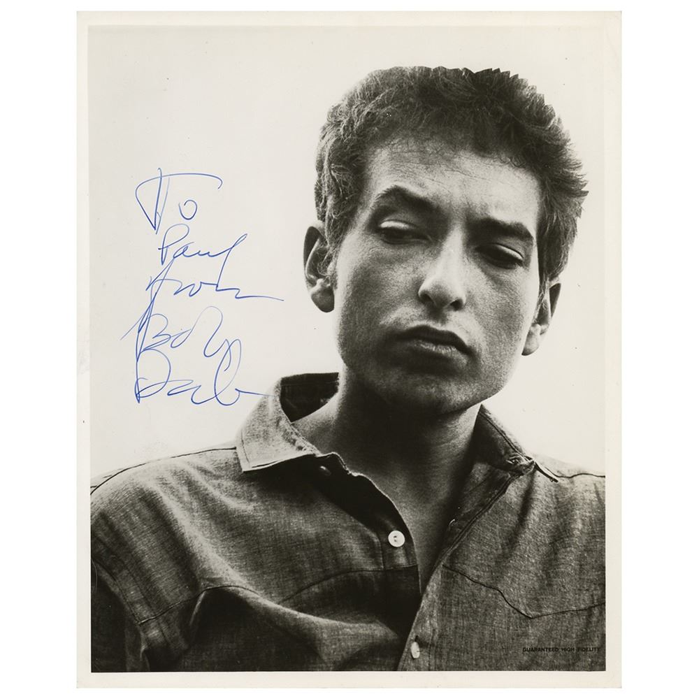 Glossy 8 x 10 photo of Dylan as he appeared on the cover of his 1964 album The Times They Are a-Changin', signed and inscribed in blue ink, "To Paul, from Bob Dylan." In fine condition, with small creases touching Dylan's face and a few surface impressions. An iconic pose from one of the most influential figures in modern music.