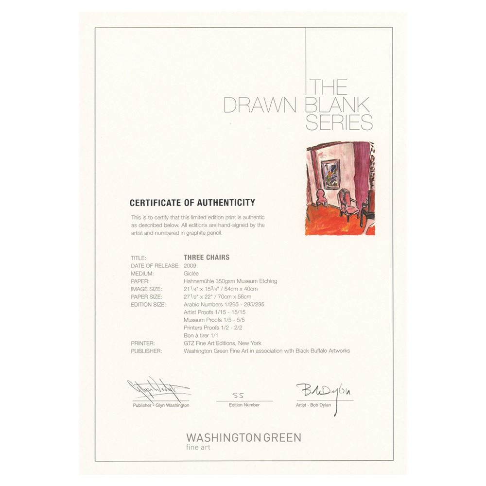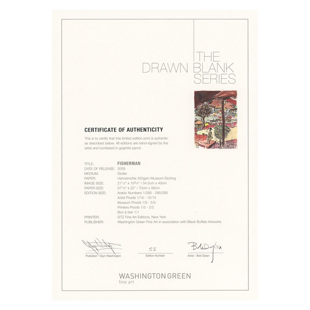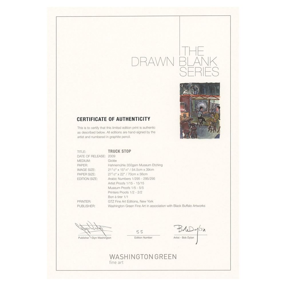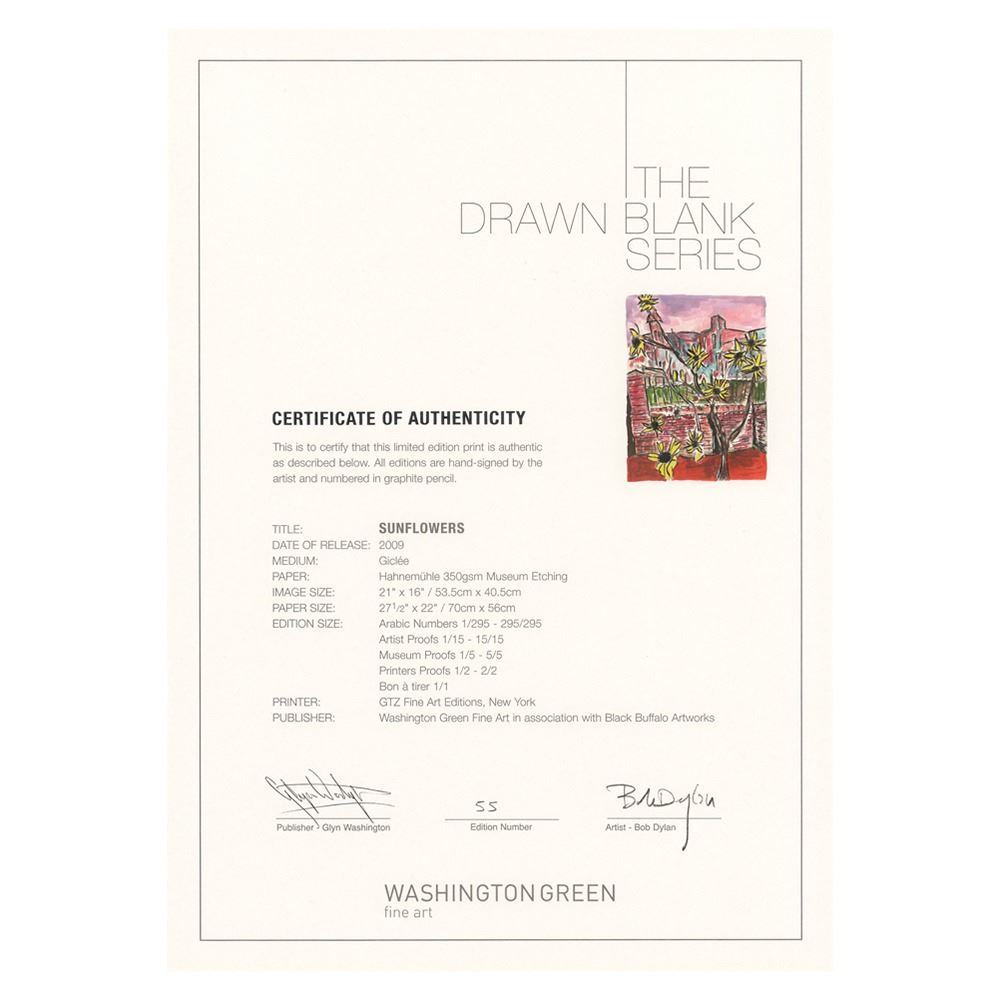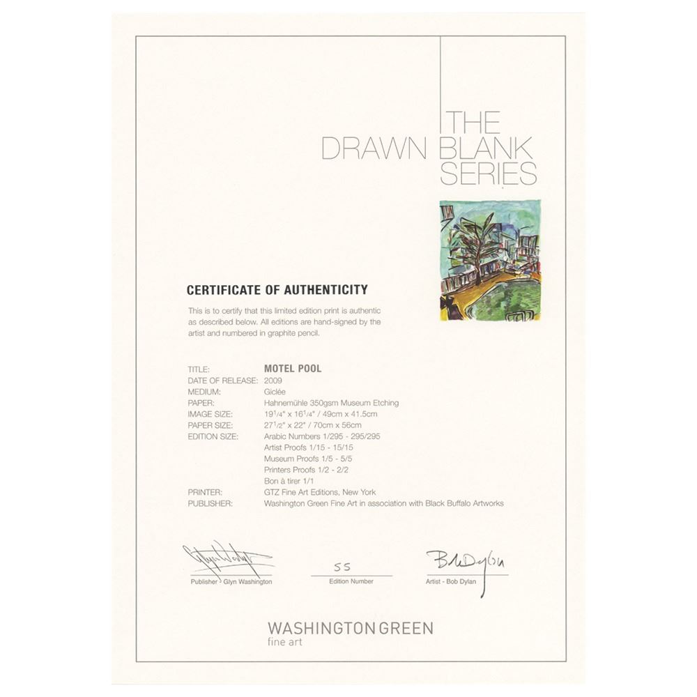 Exquisite suite of eight limited edition giclee prints from the 2009 release of Bob Dylan's 'Drawn Blank' series, all numbered 55/295, 22 x 27.5, each signed in the lower border in pencil by Dylan. Artwork titles are: 'Motel Pool,' 'Rooftop Bar,' 'Bicycle,' 'Fisherman,' 'Rose on a Hillside,' 'Sunflowers,' 'Three Chairs,' and 'Truck Stop.' Each print is housed in its original folder and includes a certificate of authenticity from Washington Green Fine Art; the set is housed in its hard portfolio case. In very fine condition. Dylan's popular Drawn Blank art series—a visual autobiography capturing his life on the road—colorfully portrays the people and places he has encountered over the course of his 'Never Ending Tour.' A stunning set of prints from the multi-talented singer-songwriter.