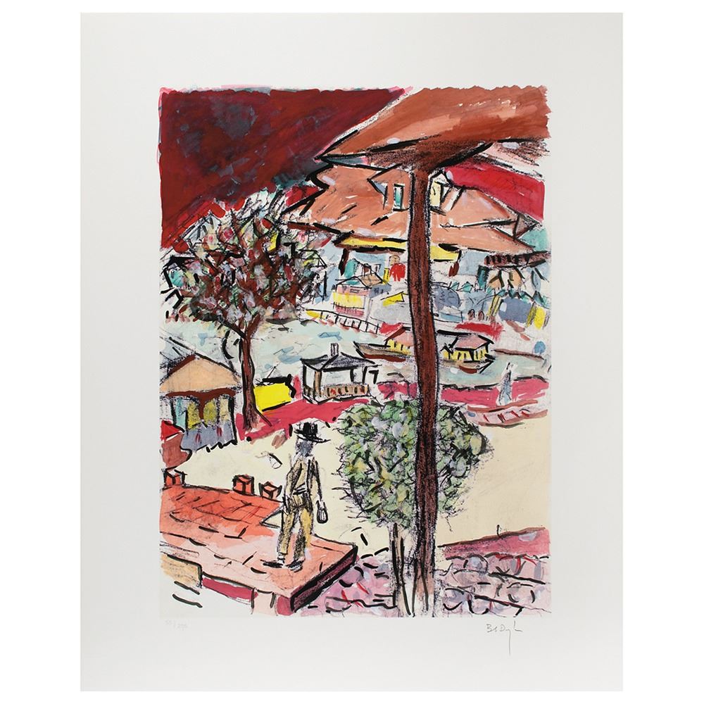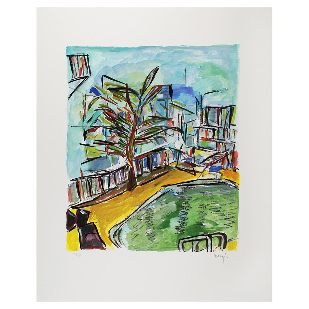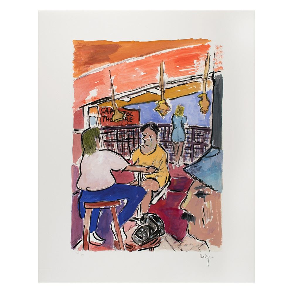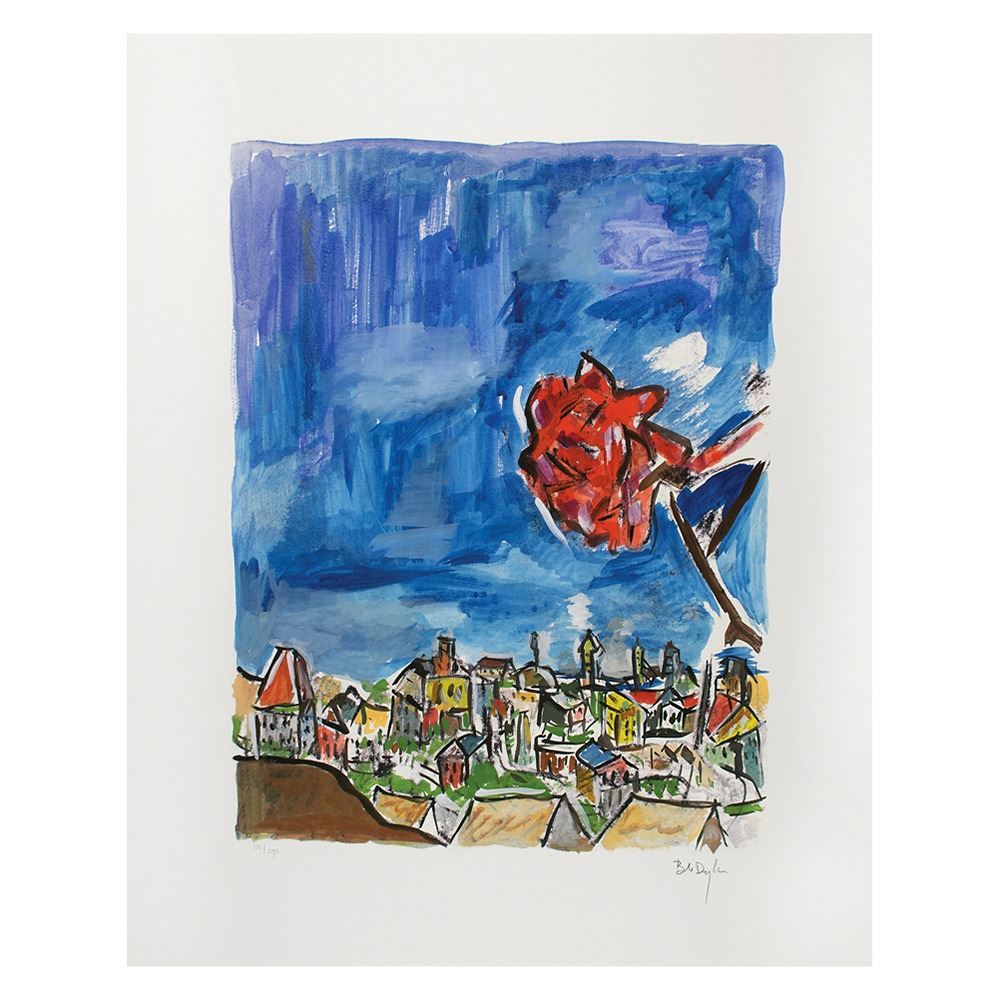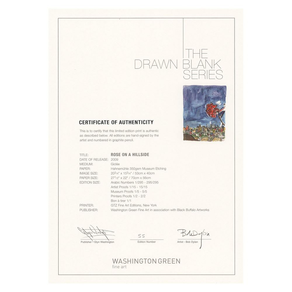 Exquisite suite of eight limited edition giclee prints from the 2009 release of Bob Dylan's 'Drawn Blank' series, all numbered 55/295, 22 x 27.5, each signed in the lower border in pencil by Dylan. Artwork titles are: 'Motel Pool,' 'Rooftop Bar,' 'Bicycle,' 'Fisherman,' 'Rose on a Hillside,' 'Sunflowers,' 'Three Chairs,' and 'Truck Stop.' Each print is housed in its original folder and includes a certificate of authenticity from Washington Green Fine Art; the set is housed in its hard portfolio case. In very fine condition. Dylan's popular Drawn Blank art series—a visual autobiography capturing his life on the road—colorfully portrays the people and places he has encountered over the course of his 'Never Ending Tour.' A stunning set of prints from the multi-talented singer-songwriter.