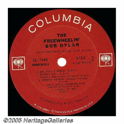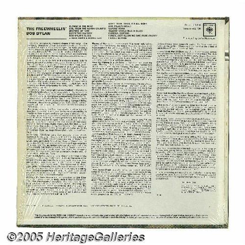 <B>Bob Dylan "The Freewheelin' Bob Dylan" LP Columbia 1986 Mono with Four Deleted Tracks (1963).</B></I> Featured here is the record that the Goldmine Album Guide lists at the top of its "100 Most Valuable U. S. Albums" chart. After "Freewheelin' " was recorded in 1963, there were four tracks that did not make the final release -- "Talkin' John Birch Society Blues," "Let Me Die in My Footsteps," "Rocks and Gravel," and "Gamblin' Willies Dead Man's Hand." The reasons for this depend on whom you ask; some say CBS pressured Dylan to remove "Talkin' John Birch" because they feared some would find it offensive, others say Dylan simply chose to reshuffle the the track list for artistic reasons (a number of tracks recorded with a full backing band had already been scrapped to maintain Dylan's presence as an acoustic folk performer). Either way, the first version of the album was ready to be shipped when it was pulled and restamped; somehow a number of those original discs were relabeled and released into circulation, and have become much sought-after collectors' items. In the mid-1990s a couple of mono copies sold for $10,000 to $12,000, and the only two stereo copies of this version to be discovered are valued at $35,000 to $40,000. The cover on this copy is in MT- condition and still in the original shrink wrap; the record itself is in VG+ condition with some minor noise on "Blowin' in the Wind." You won't have a better chance to own one of the most desirable rare records in the world.