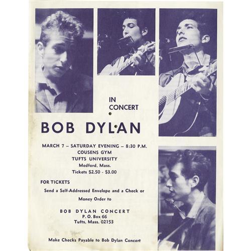 <B>Bob Dylan Tufts University Concert Handbill (1964).</B></I> By the time <I>The Times They Are A-Changin'</B></I> was released in early 1964, Bob Dylan's songwriting had developed far beyond that of his New York peers. Heavily inspired by poets like Arthur Rimbaud and John Keats, it had developed a more literate and evocative quality. Dylan had also begun to expand his musical boundaries, adding more Blues and R&B influences to his songs. This handbill for Dylan's March 7, 1964, concert at Tufts University, given during that early transitional period, features four photos of the musician. In Very Fine condition with two small punch holes in the center, a fold crease, and mild staining to the bottom and left edges.