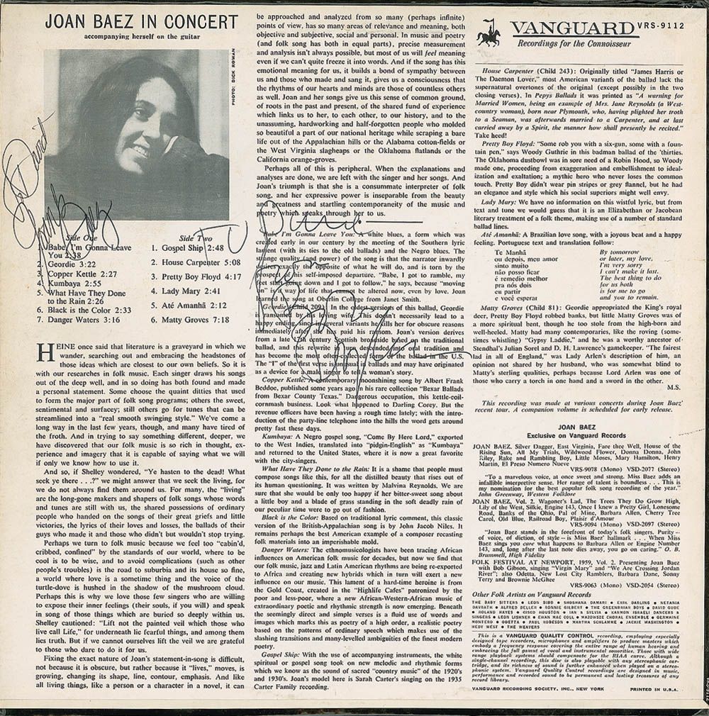 Joan Baez in Concert album signed and inscribed on the back cover in black ink, in-person, “To Dave from Bob Dylan,” and “David, Joan Baez.” In fine condition, with some scattered light wear to covers. The record is included. Consignor notes that signatures were acquired in-person at Club 47 in Harvard Square after an Arts Festival appearance in 1964 or 65. A scarce and exceptionally desirable combination of signatures acquired around the time the duo’s personal relationship had begun to dissolve.