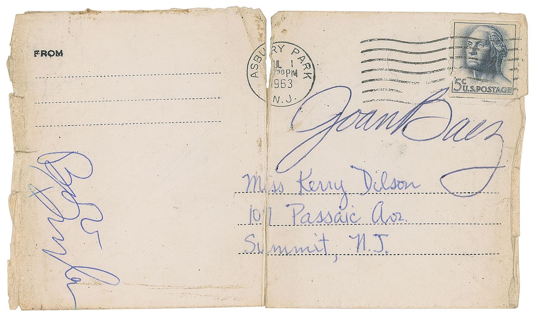 Two sides of a mailing envelope, measuring 6.25 x 3.75 together, postmarked at Asbury Park, New Jersey on July 1, 1963, signed in ballpoint on one side by Bob Dylan and on the other by Joan Baez. In very good condition, with edge wear impinging on Dylan's signature, and aforementioned complete vertical separation to the center. Consignor notes that the autographs were obtained at a Baez concert at the Asbury Park Convention Hall on August 10, 1963; during the show Baez invited Bob Dylan onstage to perform. Accompanied by a certificate of authenticity from Tracks.