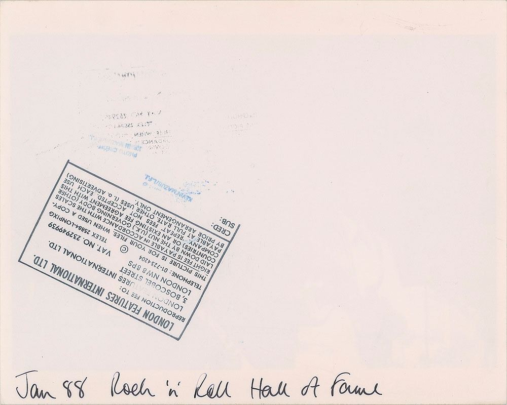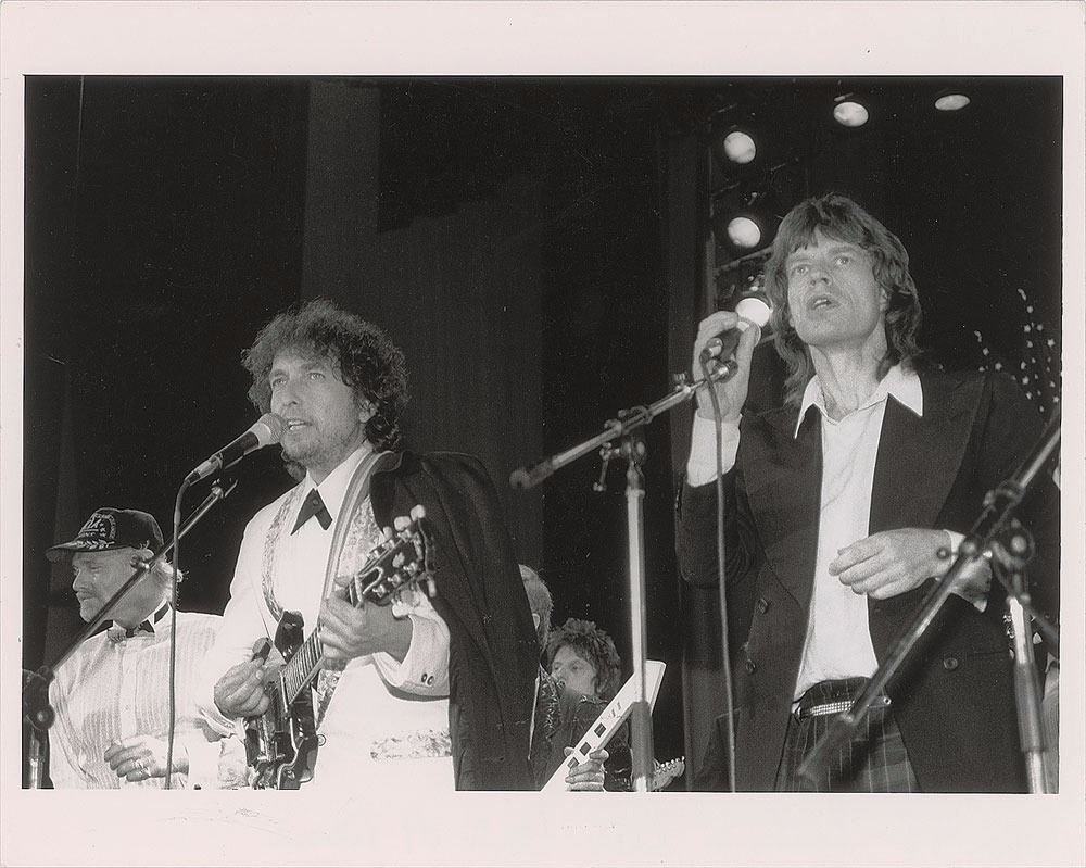 Original vintage glossy 10 x 8 silver gelatin photo of Bob Dylan and Mick Jagger performing at the Rock and Roll Hall of Fame in January 1988. Reverse bears a Kevin Mazur/London Features International credit stamp and handwritten caption. In fine condition. From the Globe Photo archives.
