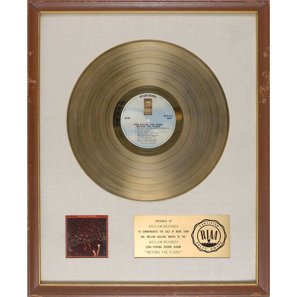 White matte RIAA gold record sales award presented to Asylum Records “to commemorate the sale of more than one million dollars worth of the…long-playing record album ‘Before The Flood.’” Matted and framed with the plaque and a small reproduction of the album’s cover to an overall size of 17.5 x 21.5. The backing has been replaced. In fine condition.