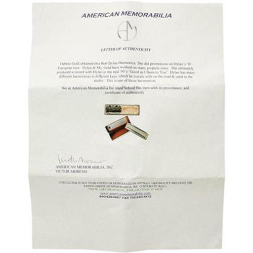 <B>Bob Dylan's Harmonica.</B></I> This Marine Band harmonica in the key of G was manufactured by Hohner and owned and used by Bob Dylan. The Folk and Rock legend has used numerous harmonicas in assorted keys during his career, taking them with him on the road and in the studio, and this is one such instrument, in Excellent condition and in its original box. <I>Accompanied by a COA from American Memorabilia.</B></I><BR><BR><b>Shipping:</b> Musical Instruments, Large (<a target="_blank" href="http://www.heritageauctions.com/common/shipping.php">view shipping information</a>)