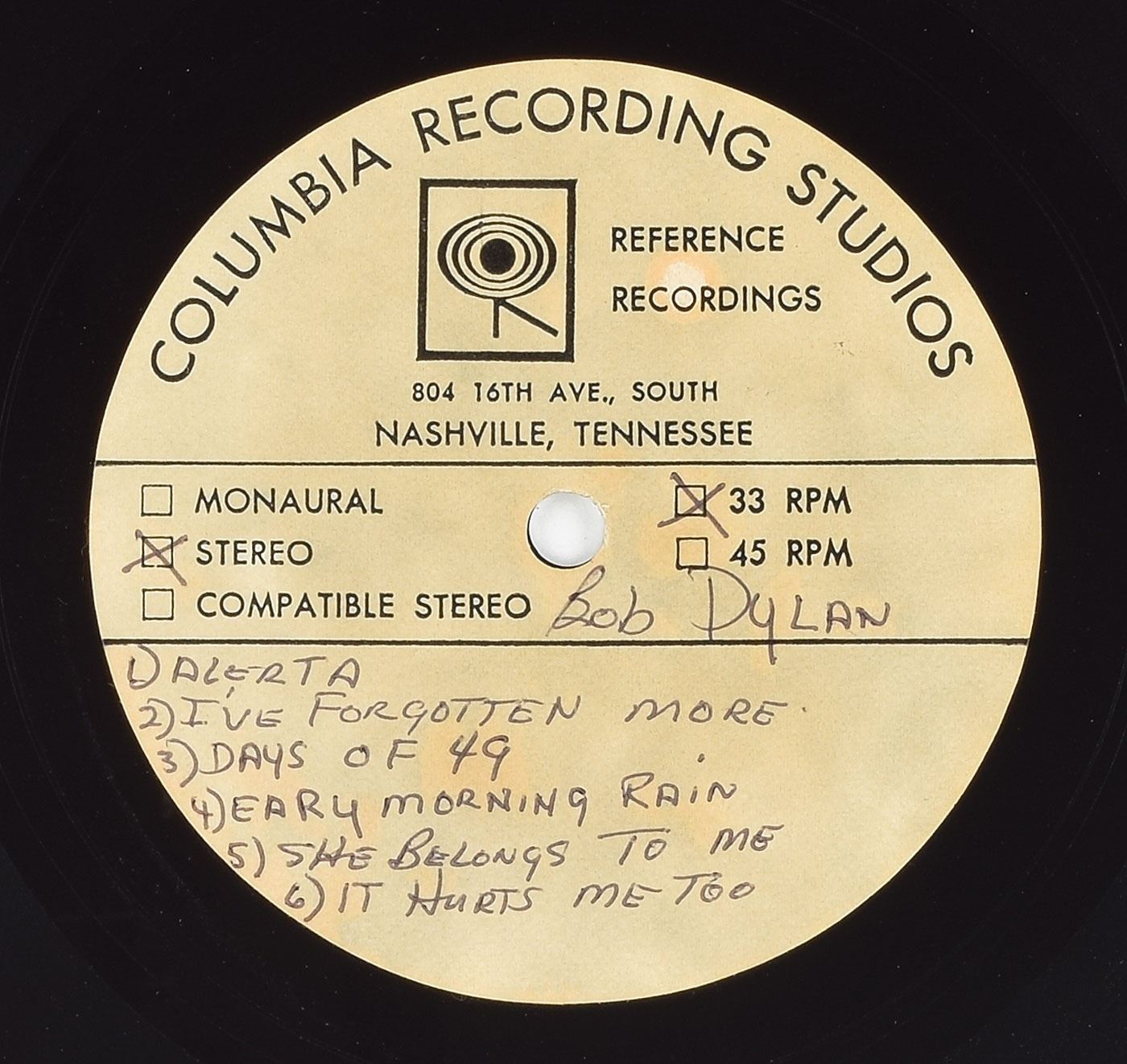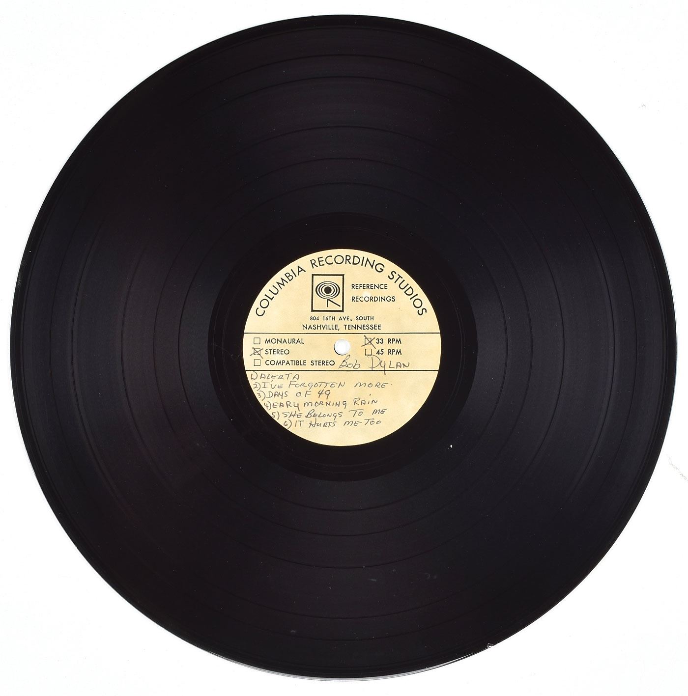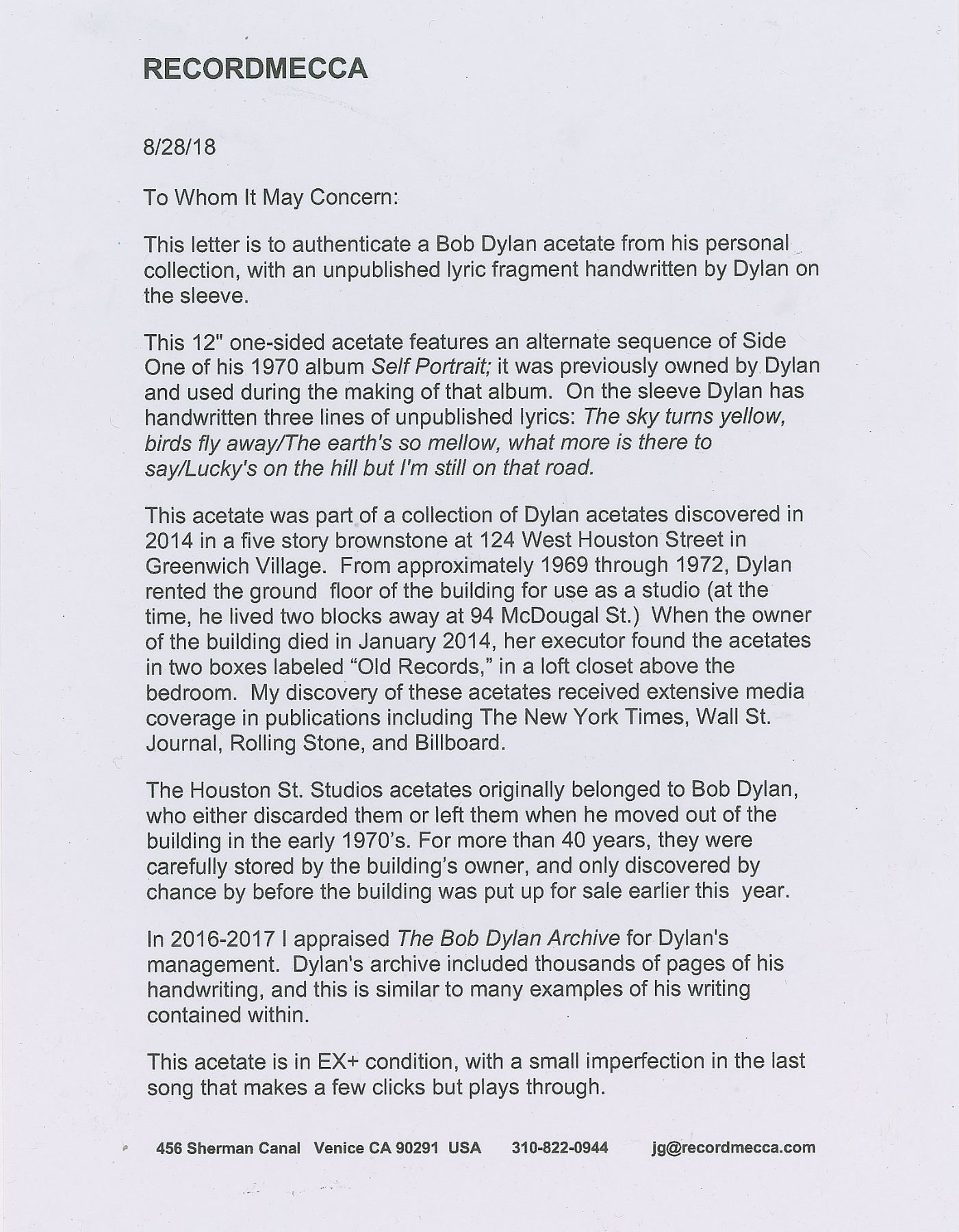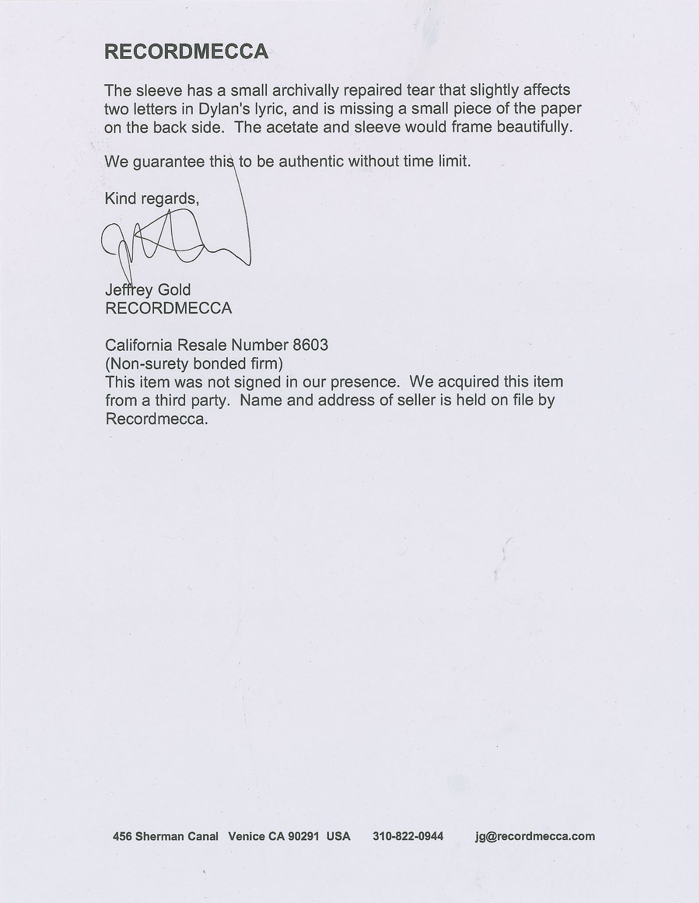 Accompanied by a detailed letter of authenticity from Dylan handwriting expert Jeff Gold, the owner of Recordmecca who appraised The Bob Dylan Archive for Dylan’s management. In part: "This acetate was part of a collection of Dylan acetates discovered in 2014 in a five story brownstone at 124 West Houston Street in Greenwich Village. From approximately 1969 through 1972, Dylan rented the ground floor of the building for use as a studio (at the time, he lived two blocks away at 94 McDougal St.) When the owner of the building died in January 2014, her executor found the acetates in two boxes labeled 'Old Records,' in a loft closet above the bedroom. My discovery of these acetates received extensive media coverage in publications including The New York Times, Wall St. Journal, Rolling Stone, and Billboard.