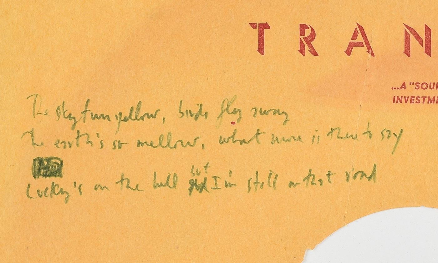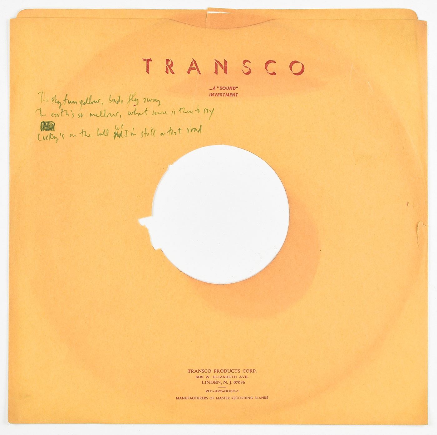 Extraordinary single-sided 12? acetate from Bob Dylan's personal collection, featuring an alternate sequence of side one of his 1970 album Self Portrait, with its original Transco sleeve, annotated in Dylan's hand with three lines of unpublished lyrics: "The sky turns yellow, birds fly away / The earth's so mellow, what more is there to say / Lucky's on the hill but I'm still on that road." The acetate features a Columbia Recording Studios label, marked "Stereo" and "33 RPM," and is labeled in another hand with the artist and track listing (spelling retained): "Bob Dylan, 1) Alerta, 2) I've Forgotten More, 3) Days of 49, 4) Eary Morning Rain, 5) She Belongs to Me, 6) It Hurts Me Too." In overall very good to fine condition, with some toning and chipping to the sleeve, a small archivally repaired tear that slightly affects two letters in Dylan’s handwritten lyrics, and a small area of paper loss to the back side; a small imperfection in the last song on the acetate makes a few clicks but plays through.