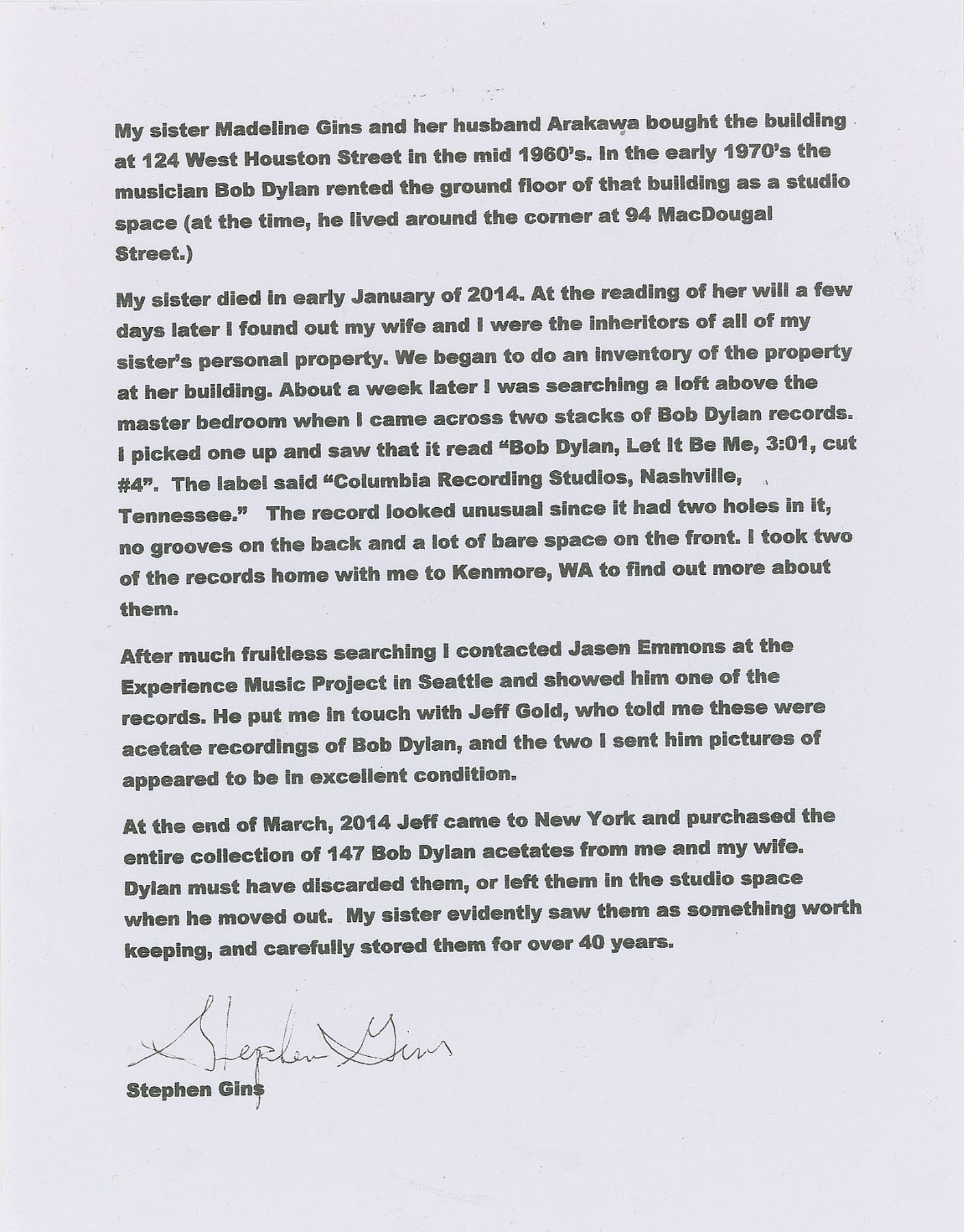 The Houston St. Studios acetates originally belonged to Bob Dylan, who either discarded them or left them when he moved out of the building in the early 1970’s. For more than 40 years, they were carefully stored by the building’s owner, and only discovered by chance by before the building was put up for sale." Also includes a copy of a letter by the estate’s executor detailing his discovery of the acetates.