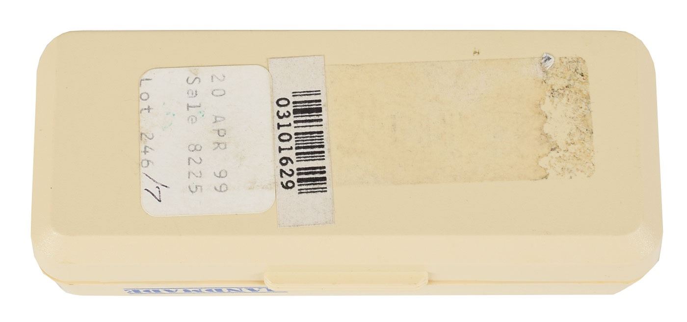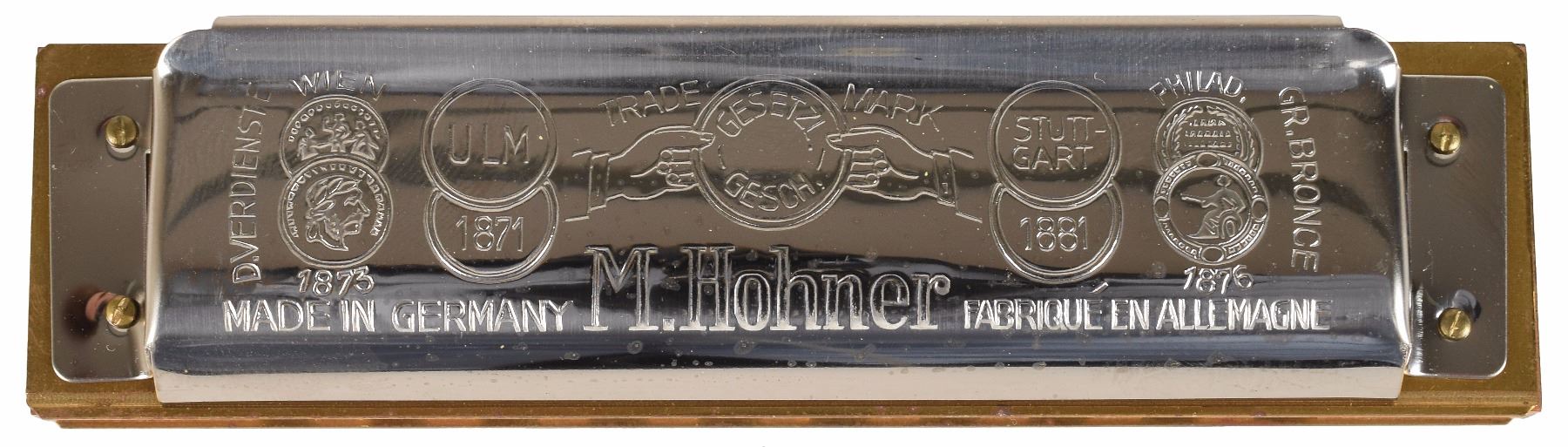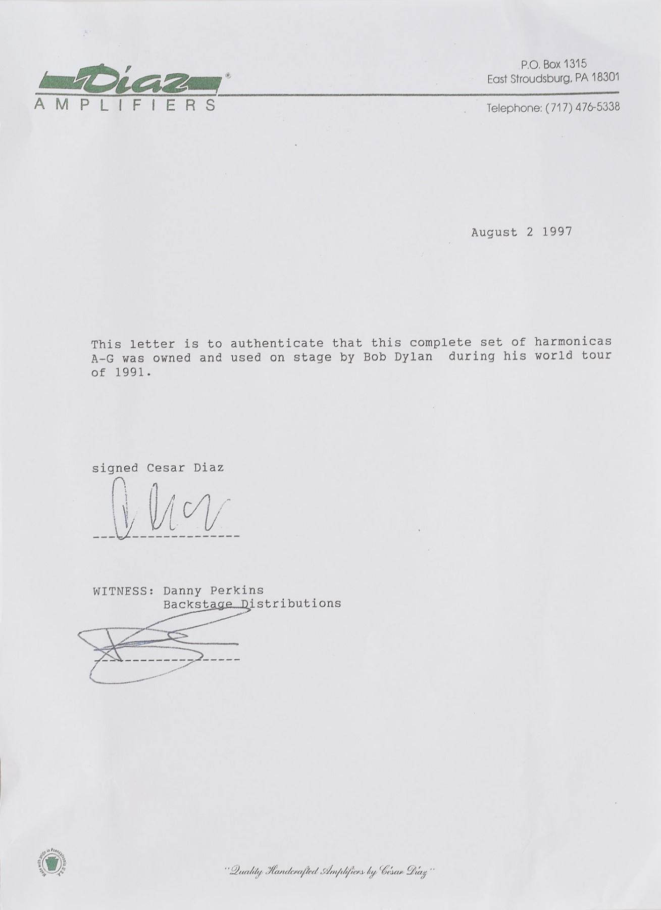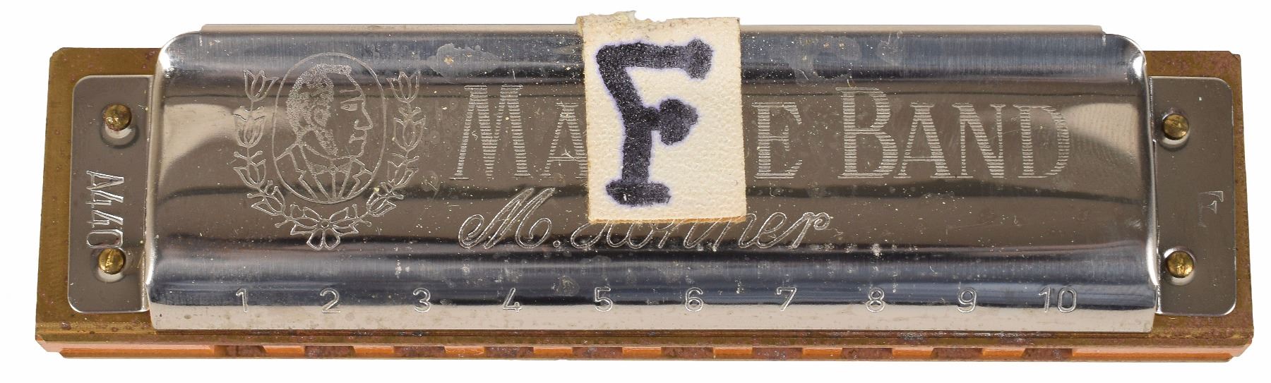 Bob Dylan's stage-used M. Hohner Marine Band harmonica in the key of F, played during his 1991 world tour. Originating from Dylan's longtime guitar technician Cesar Diaz, the top surface of the harmonica is marked with the corresponding key on a small piece of white tape. Complete with its original plastic case. In fine condition. Accompanied by a color copy of the letter of provenance from Diaz that was included with the complete set when it was originally sold by Christie's in 1999; affixed to the bottom of the case is the Christie's label, reading: "20 Apr 99, Sale 8225, Lot 246/7." Besides Dylan, Diaz worked with number of high profile musicians, most notably Stevie Ray Vaughan, Eric Clapton, Keith Richards and Neil Young. Diaz was also called into service as a guitarist in Dylan’s touring band in 1991, playing on nearly fifty dates after G. E. Smith left the band. Dylan began playing the harmonica in high school, and its distinct sound is prevalent in many of his early works. As a concert-used instrument that helped to shape Dylan's trademark early sound, this is an extremely desirable piece.