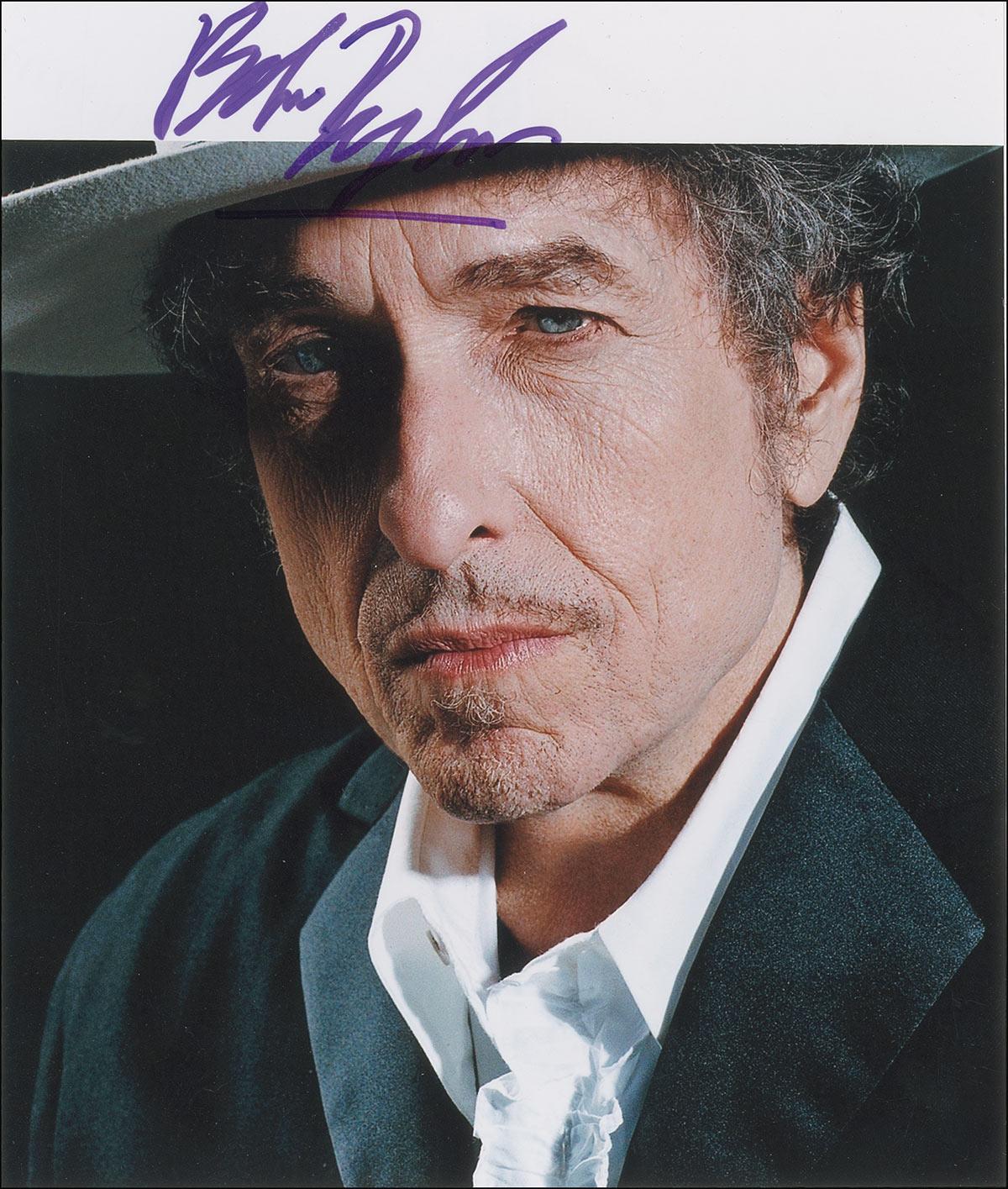 Color satin-finish 7.25 x 9 close-up photo, signed along the top border in purple felt tip by Dylan. In fine condition. Consignor notes signature was originally acquired by the daughter of the director of the Concert Hall Wiener Stadthalle before his concert in Vienna on June 10, 2008. She obtained the signature backstage in a private smoking area where Dylan was with other band members. Dylan signed photos are highly prized by rock and roll collectors.