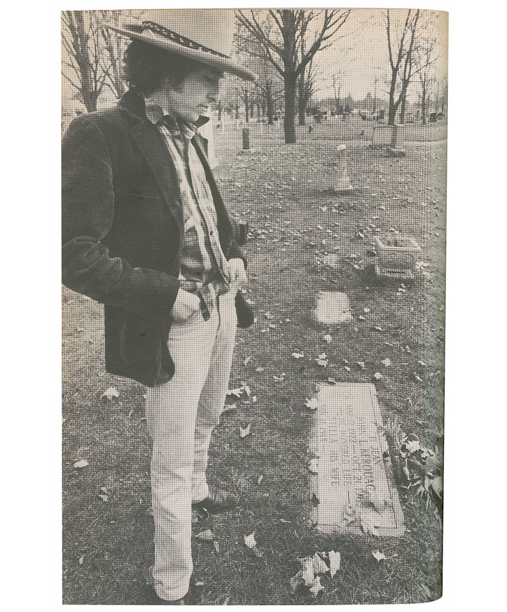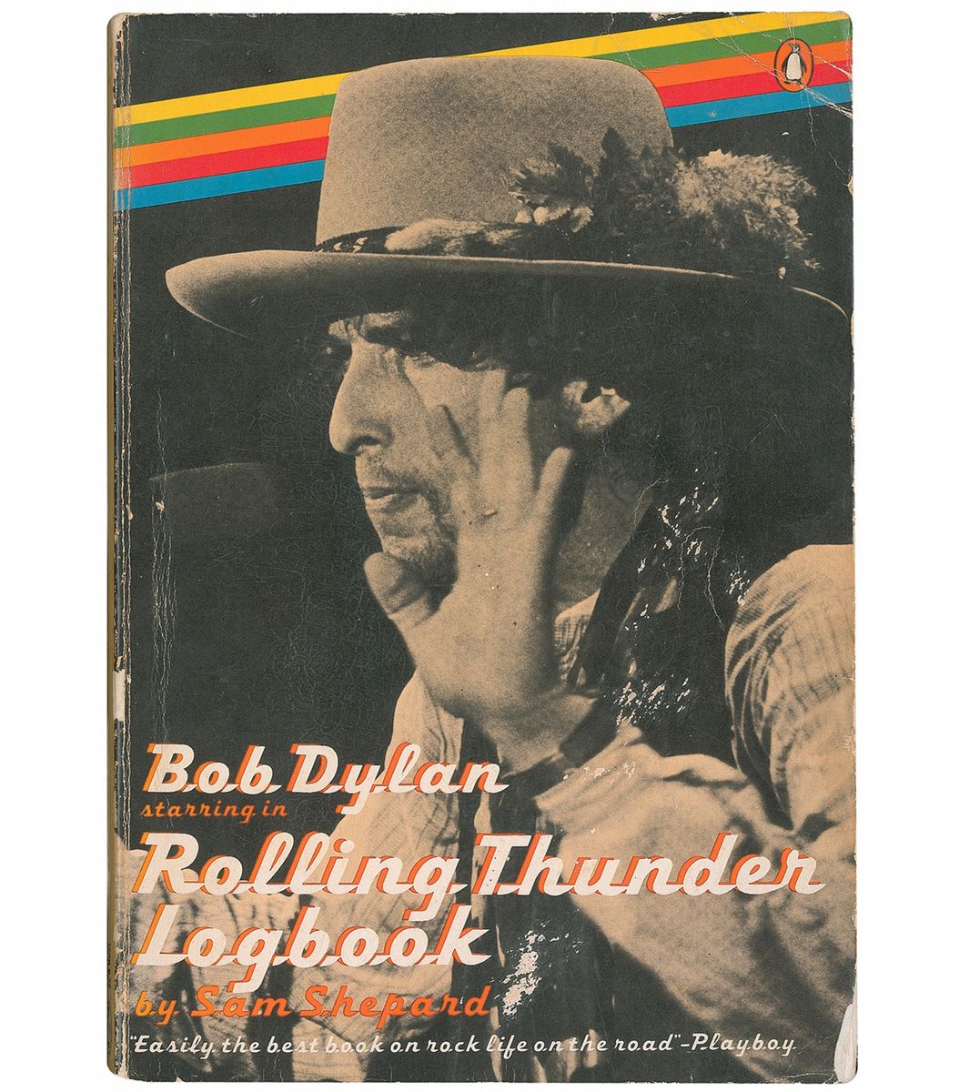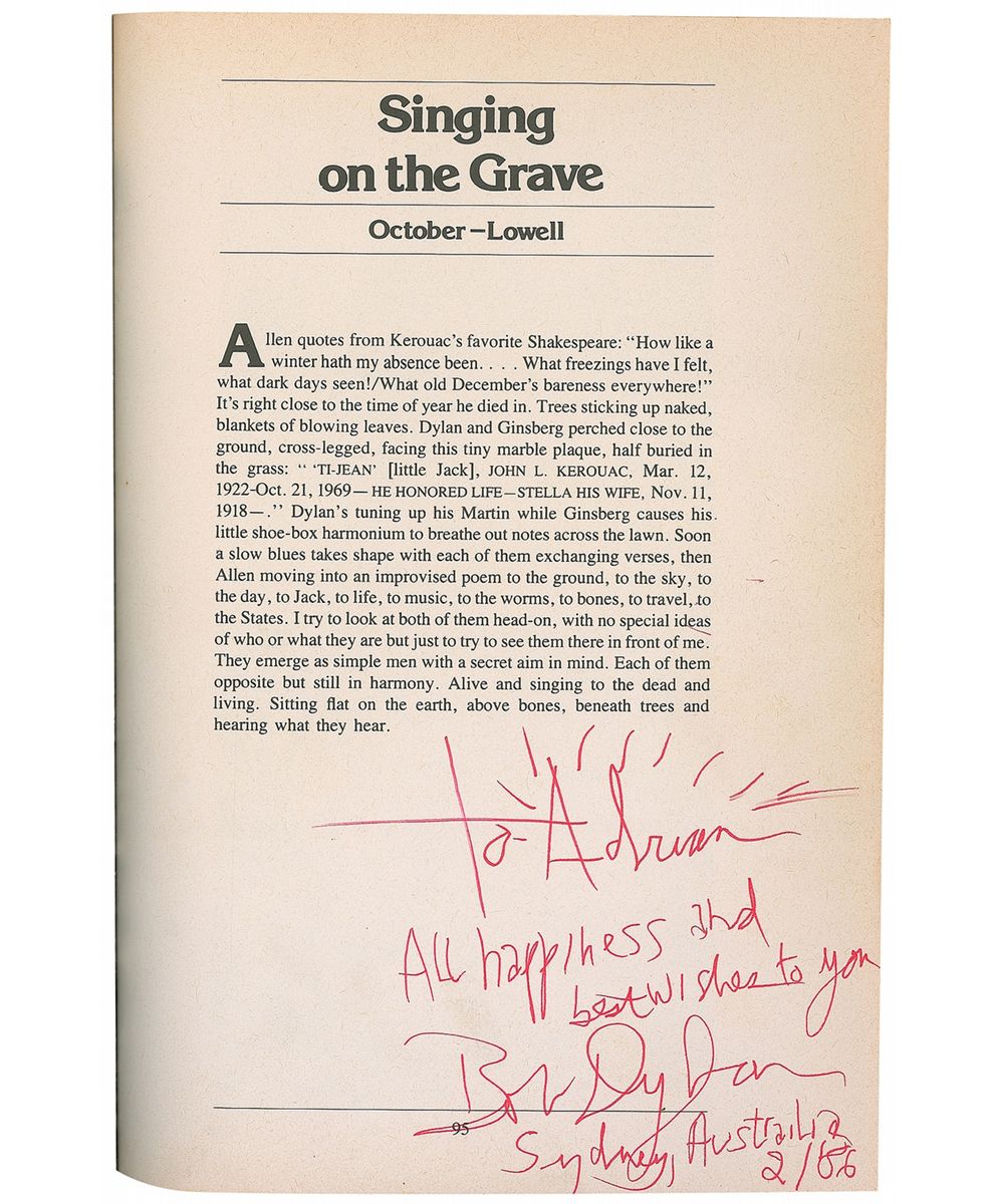 Signed book: Rolling Thunder Logbook. Later printing. NY: Penguin Books, 1978. Softcover, 7 x 10, 184 pages. Signed and inscribed in red ink on page 95, opposite a full-page image of Dylan at Jack Kerouac’s grave, to Australian poet and music journalist Adrian Rawlins, “To Adrian, All happiness and best wishes to you, Bob Dylan, Sydney, Australia, 2/86.” Inscribed autographs of Dylan are rare from any era; this example for Rawlins, who wrote extensively on Dylan and compiled his articles in a book ‘Bob Dylan Through the Looking Glass,’ was procured during the Australian leg of the ‘True Confessions’ tour in 1986. Scattered creases, surface marks, impressions and soiling to covers, a price label on back cover, some slight foxing to opening pages, and a pencil notation to first free end page, otherwise fine condition.