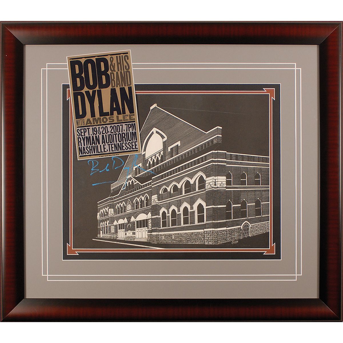 Eye-catching print, 19 x 15, of the Ryman Auditorium in Nashville, Tennessee, signed in blue ink. Triple matted and framed to an overall size of 33.25 x 29. In fine condition. Accompanied by a notarized letter of provenance from the original recipient detailing the two-day attempt to obtain Dylan’s signature outside the Wheel Club on September 20, 2007. Oversized.