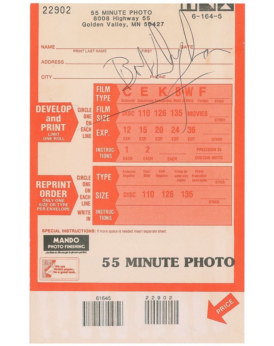 55 Minute Photo of Golden Valley, Minnesota film envelope, 5.5 x 8.5, signed on the front in black ballpoint by Dylan. In fine condition, with a mild shade of overall toning. Accompanied by a letter of provenance from the original recipient, the owner of the photo shop, who acquired the signature on July 4, 1982, stating he saw “Bob Dylan going into a card store next door. I grabbed a photofinishing envelope and a pen and waited out on the sidewalk in front of the card store. When he came out a few minutes later…he kindly signed the envelope but did not speak to me.”