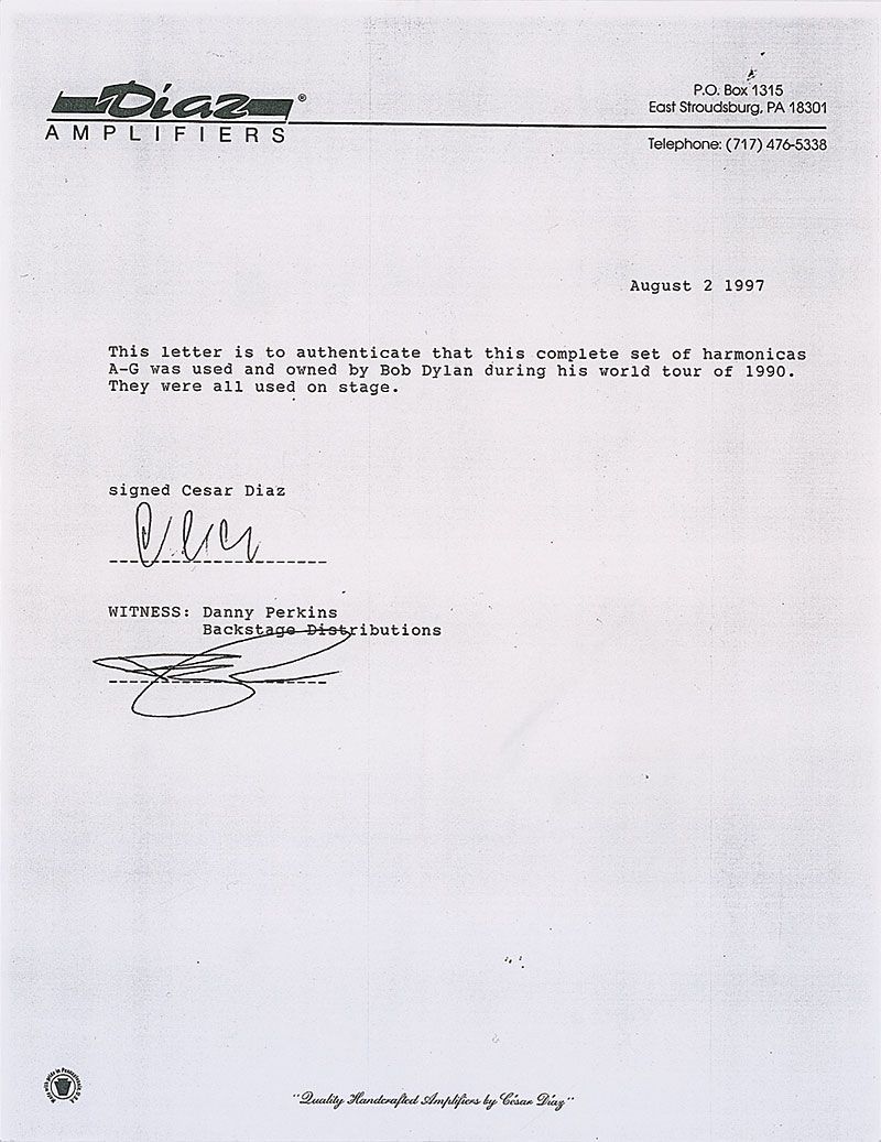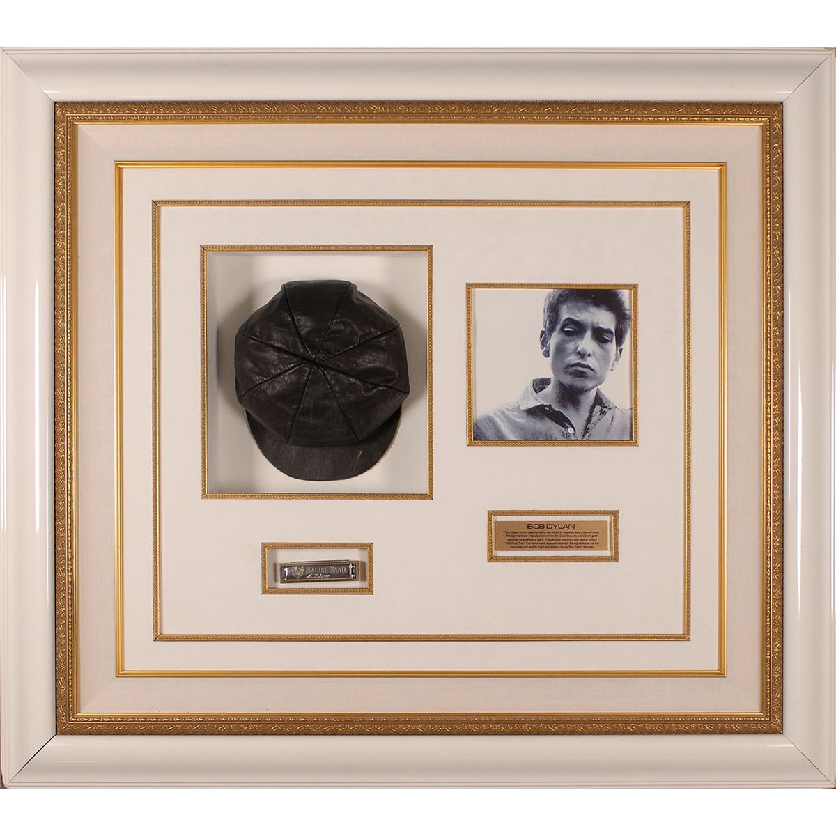 Two items personally-owned and used-by Bob Dylan: a personally-owned and-worn black leather motorcycle-style hat, originally donated by Dylan’s management to Evander Holyfield’s charity auction; and a concert used M. Honher “B” Marine Band harmonica from his 1990 World Tour, obtained from Dylan’s personal guitar and amplifier tech Cesar Diaz, accompanied by a photocopied letter of provenance from Diaz regarding the harmonica, one of a complete set (A-G) which Dylan used on stage. It was not uncommon for Diaz to provide a single LOA for multiple harmonicas. The original LOA was photocopied when harmonicas from the original set were sold singularly. Diaz began his association with Dylan in 1986; leaving in 1993 to devote time to his amplifier business. In 1991, Diaz played guitar on nearly 50 concert dates. Besides Bob Dylan, Caesar Diaz worked with a number of high profile musicians, most notably Stevie Ray Vaughan, Eric Clapton, Keith Richards, and Neil Young. Guitar World Magazine dubbed him ‘The Amp Doctor’ for his work in tube amplifier repair and modification. Both items are shadow-boxed and framed with a portrait of Dylan and a descriptive plaque to an overall size of 42 x 37. In fine condition.