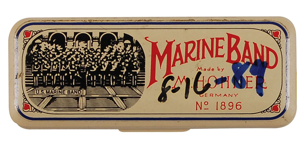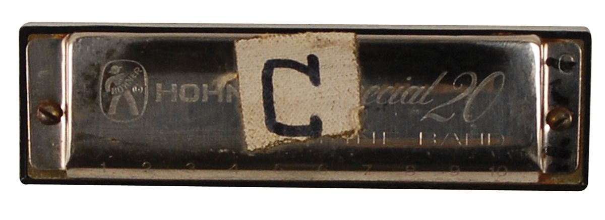Personally-played stage-used Marine Band M. Hohner harmonica. Originating from Cesar Diaz, Dylan’s longtime guitar technician, the top surface of the harmonica is marked in Diaz’s own writing with the corresponding key on a small piece of white tape, in this case “C,” and also labeled with Dylan’s name on the plastic case. Harmonica was originally acquired by Diaz and given to a friend from Penn State University he met back in the 1970s. In fine condition, with expected wear from use. Diaz began his association with Dylan in 1986; leaving in 1993 to devote time to his amplifier business. Besides Dylan, Diaz worked with number of high profile musicians, most notably Stevie Ray Vaughan, Eric Clapton, Keith Richards, and Neil Young. Diaz also performed with Dylan as a guitarist in 1991, playing on nearly fifty dates after G. E. Smith left the band.