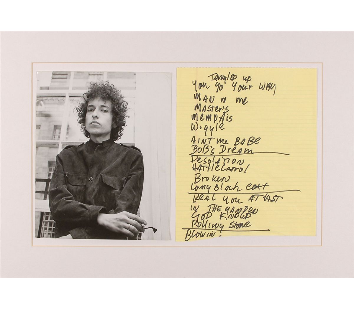Handwritten set list on a yellow 8.5 x 10.5 lined sheet, circa 1991. Dylan lists 17 songs in black felt tip, including many of his greatest—among them are “Tangled Up,” “You Go Your Way,” “Masters,” “Aint Me Babe,” “Bob’s Dream,” “Desolation,” “Hattie Carrol,” “Broken,” “Rolling Stone,” and “Blowin.” Mounted with a photo of Dylan to an overall size of 21.5 x 15. Overall creases and an irregularly trimmed bottom edge, otherwise fine condition. Accompanied by a certificate of authenticity from Roger Epperson/REAL and full letter of authenticity from JSA. A great set list containing several of Dylan’s masterpieces from the early years of his ‘Never Ending Tour.’