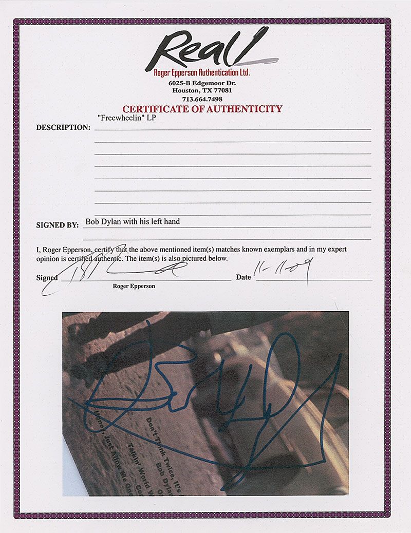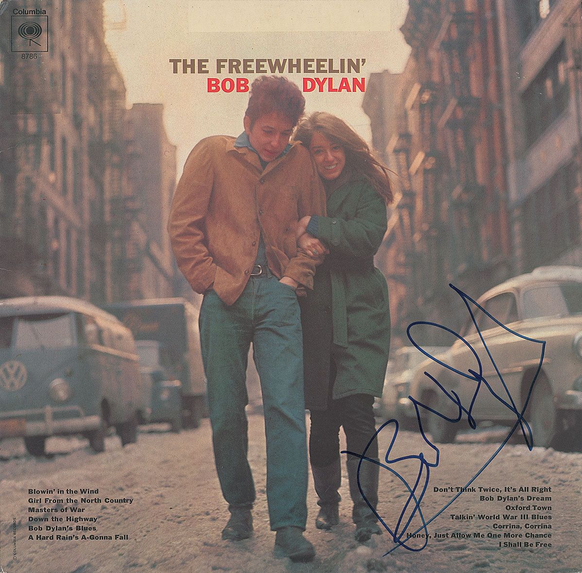 The Freewheelin’ Bob Dylan album signed on the front cover in black felt tip. In fine condition, with a couple trivial edge creases and ding to the upper left corner. The record is included. Accompanied by a detailed letter of provenance from the original collector, indicating that the album was signed in-person during a sound check at the Supper Club in New York City on November 17, 1993, as well as a certificate of authenticity from Roger Epperson/REAL.