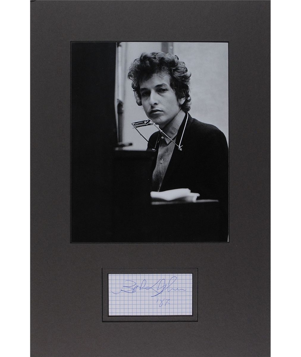 Uncommon ballpoint signature, “Bob Dylan, ’87,” on an off-white 4 x 2 lightly-lined slip of graph paper. Attractively double-matted with a photo of Dylan while recording Highway 61 Revisited to an overall size of 11.5 x 17. In fine condition.