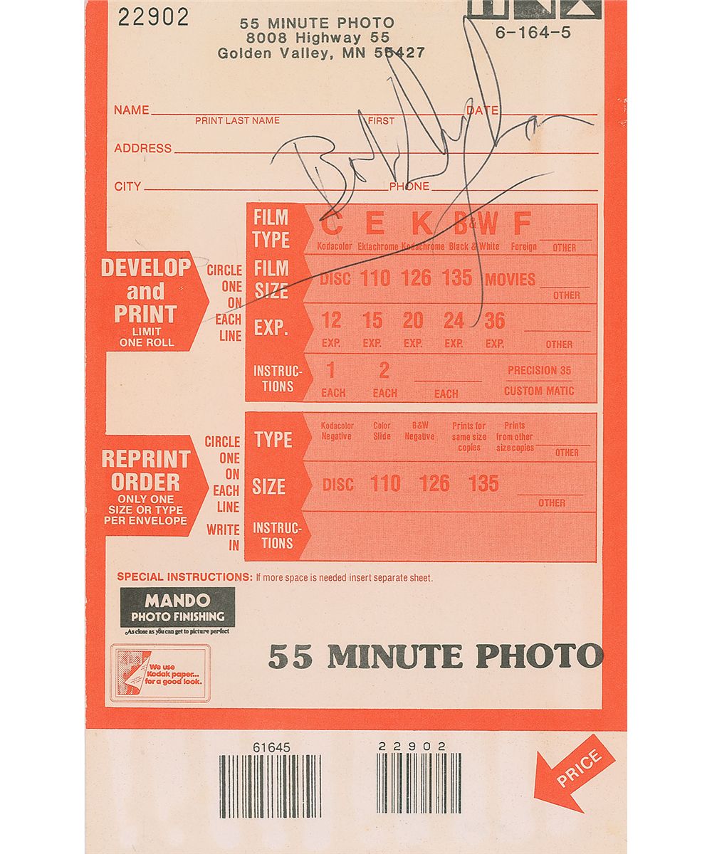 55 Minute Photo of Golden Valley, Minnesota film envelope, 5.5 x 8.5, signed on the front in black ballpoint by Dylan. In fine condition, with a mild shade of overall toning. Accompanied by a letter of provenance from the original recipient, the owner of the photo shop, who acquired the signature on July 4, 1982, stating he saw “Bob Dylan going into a card store next door. I grabbed a photofinishing envelope and a pen and waited out on the sidewalk in front of the card store. When he came out a few minutes later…he kindly signed the envelope but did not speak to me.”