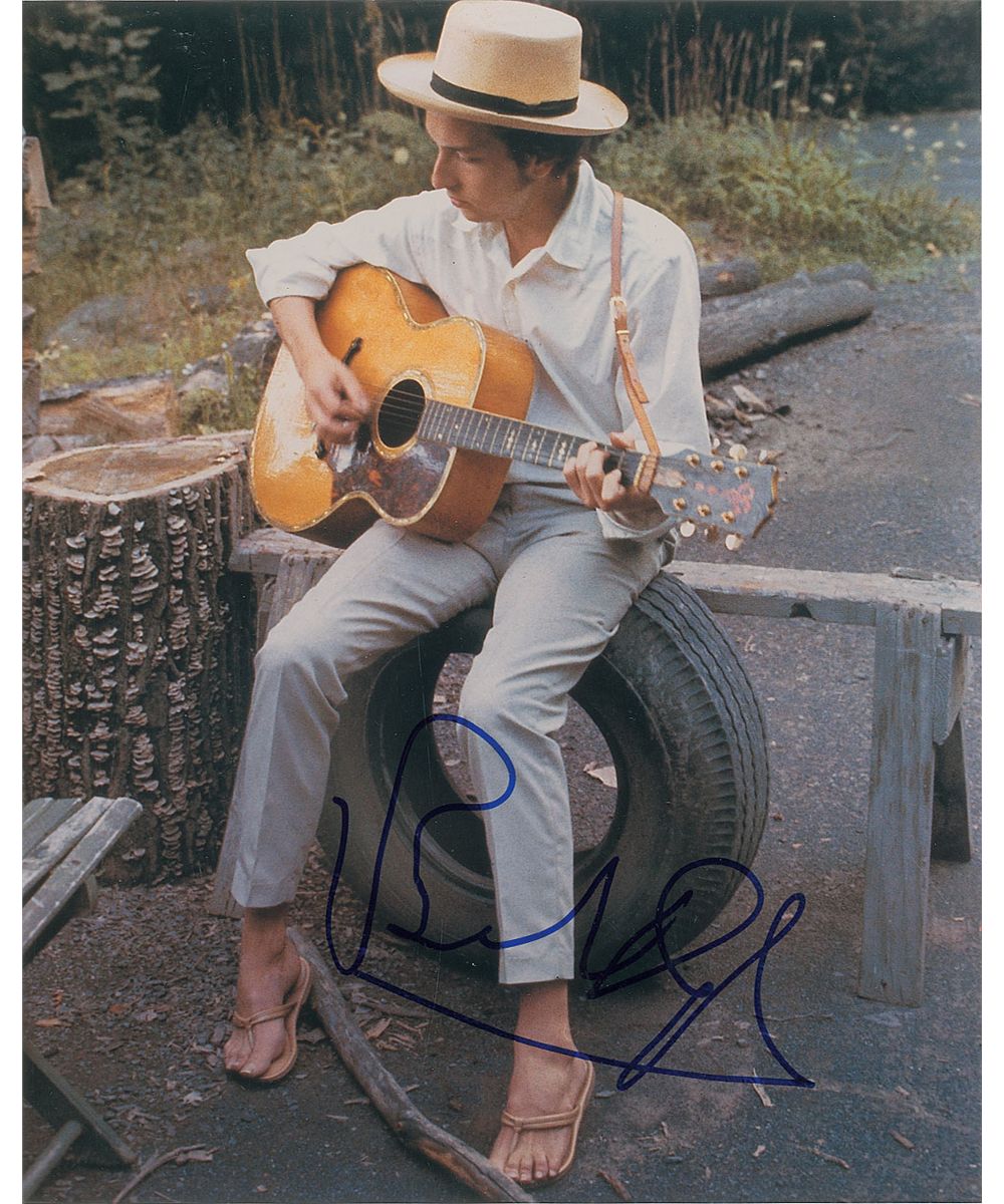 Color glossy 8 x 10 photo of Dylan playing his guitar while sitting on a tire, signed in person in blue felt tip. In very fine condition. Originally obtained by in-person specialist Mike Wehrmann.