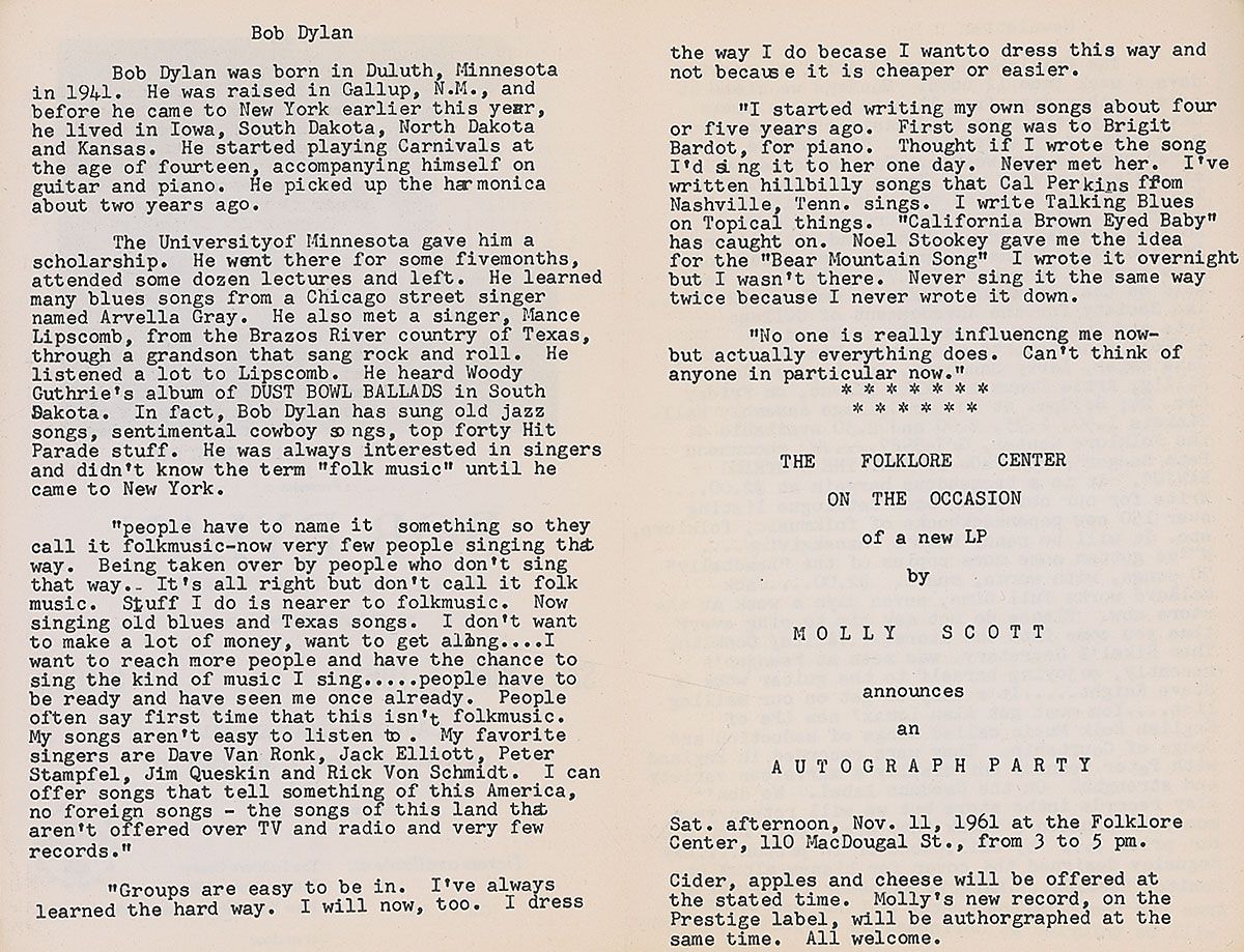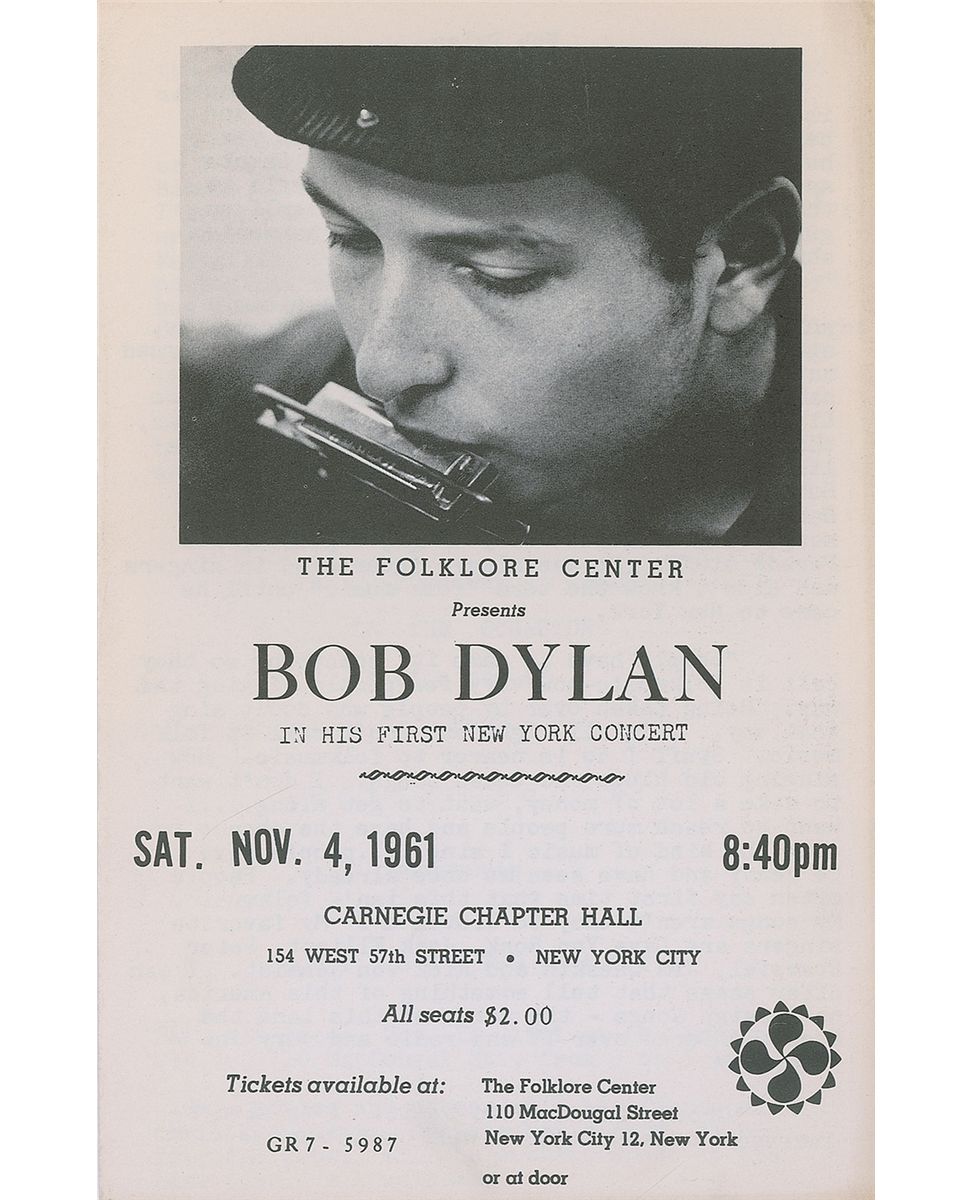 Vintage concert flyer for Dylan’s debut at New York’s Carnegie Hall, 5.5 x 8.5, two pages, at the Carnegie Chapter Hall on Saturday evening, November 4, 1961. Cover bears an image of a young Dylan, with a printed biography inside, and a Folklore newsletter on the back cover. In fine condition. This was Dylan’s first concert beyond the Greenwich Village coffeehouses, with tickets costing $2.00 each, and Dylan’s booking fee just $60.00. A landmark piece of rock and roll history documenting the beginning of Dylan’s meteoric rise.