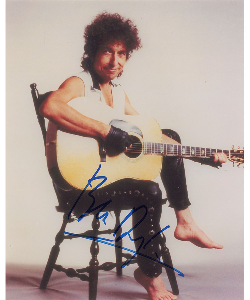 Color glossy 8 x 10 photo of Dylan strumming a flipped left-handed Martin acoustic guitar, signed in blue felt tip. In very fine condition. Originally acquired by drummer Charlie Quintana, who played in Dylan’s band for several tours. This image was captured during a 1986 sitting with Annie Liebowitz, one of the foremost portrait photographers of the modern era. Dylan is scarce in any form, and the associations with his own drummer and the renowned photographer—who got her start with Rolling Stone—make this a remarkably desirable example.