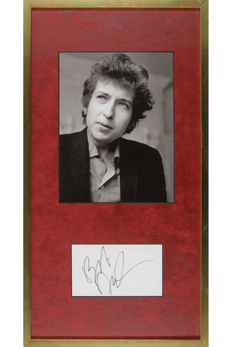 Felt tip signature, “Bob Dylan,” on a white card. Matted and framed with a portrait of a young Dylan to an overall size of 9.75 x 18.5. In fine condition, with just a bit of light show-through from printed lines on reverse.