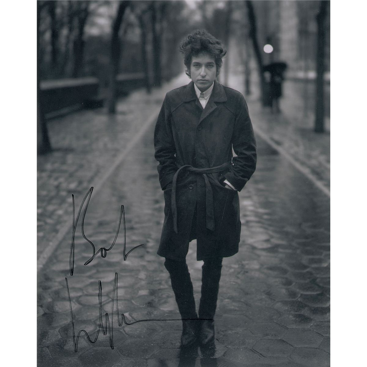 Excellent satin-finish 8 x 10 photo of a young Dylan walking down a cobbled street, signed in black felt tip. In very fine condition.