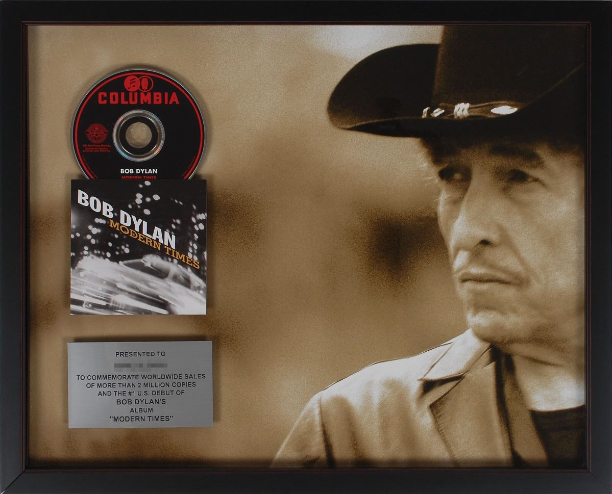 In-house double platinum sales award presented “to commemorate worldwide sales of more than 2 million copies and the #1 U.S. debut of Bob Dylan’s album ‘Modern Times.’” Framed with its plate, CD, album cover, and a large image of Dylan wearing a cowboy hat to an overall size of 21 x 17. Award retains its original backing with an Ill-Eagle Enterprises label. In fine condition.
