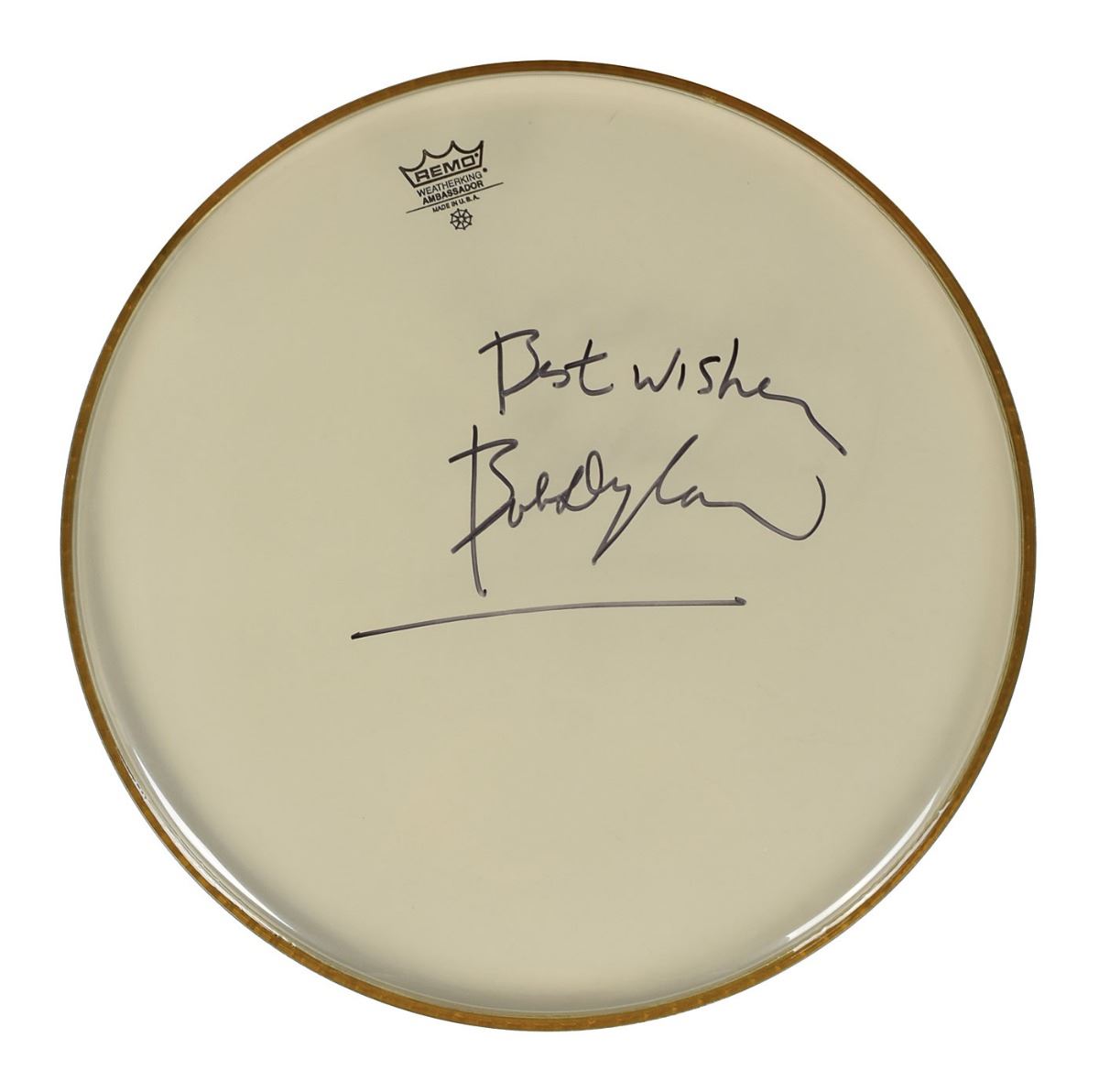 Awesome clear Remo Weatherking Ambassador drum head, 16.5? in diameter, signed in black felt tip, "Best wishes, Bob Dylan." In fine condition. Sought-after across all formats, Dylan remains particularly scarce in signed instruments. A truly uncommon format enhanced furthermore by its bold signature and great display potential.